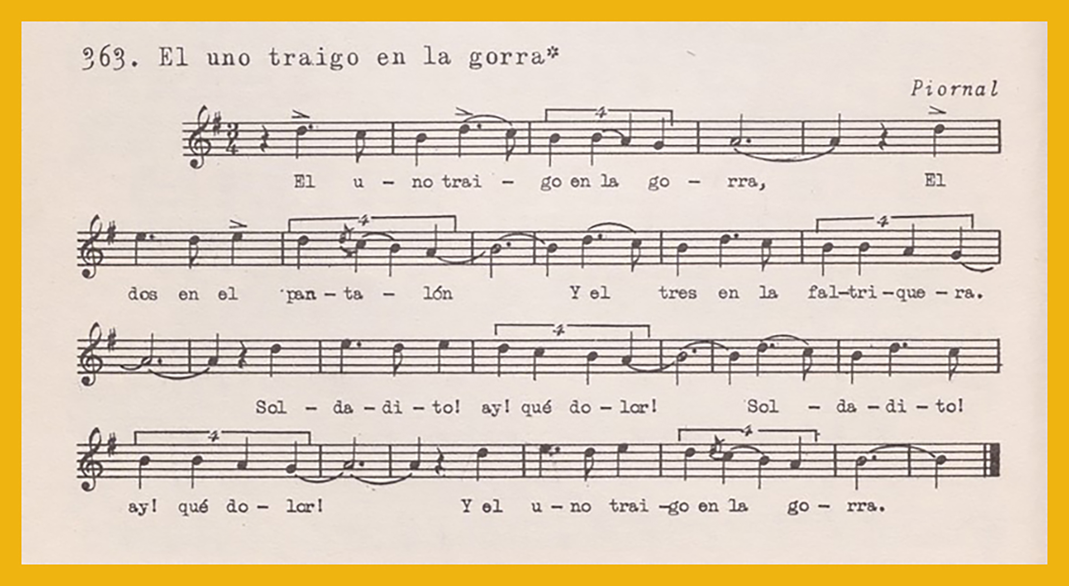 Ref. Partitura transcripción Kurt Schindler (1941): A. No se ha encontrado en registro de partitura. «El uno traigo en la gorra» registro nº 363. B. «Dicen que madruga el sol», registro nº 364.«Esta calle abajito», registro nº 365