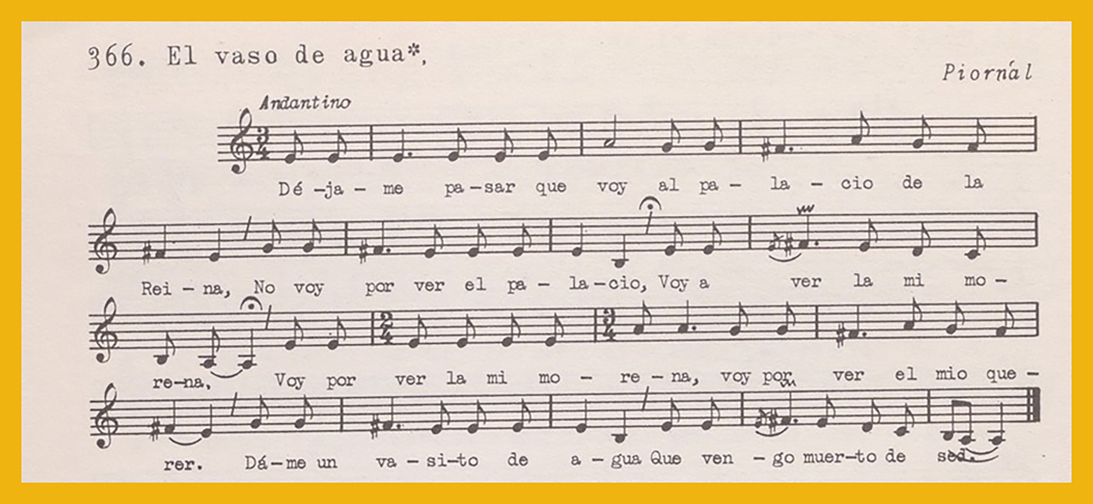 Ref. Partitura transcripción Kurt Schindler (1941): A. " Déjame pasar que voy al palacio de la reina" aparece como «El vaso de agua» registro nº 366. «Despierta, mi bien» registro nº 367. B.«A San Roque», registro nº 368. «Ángeles y serafines (Cantar de Reyes)», registro nº 369