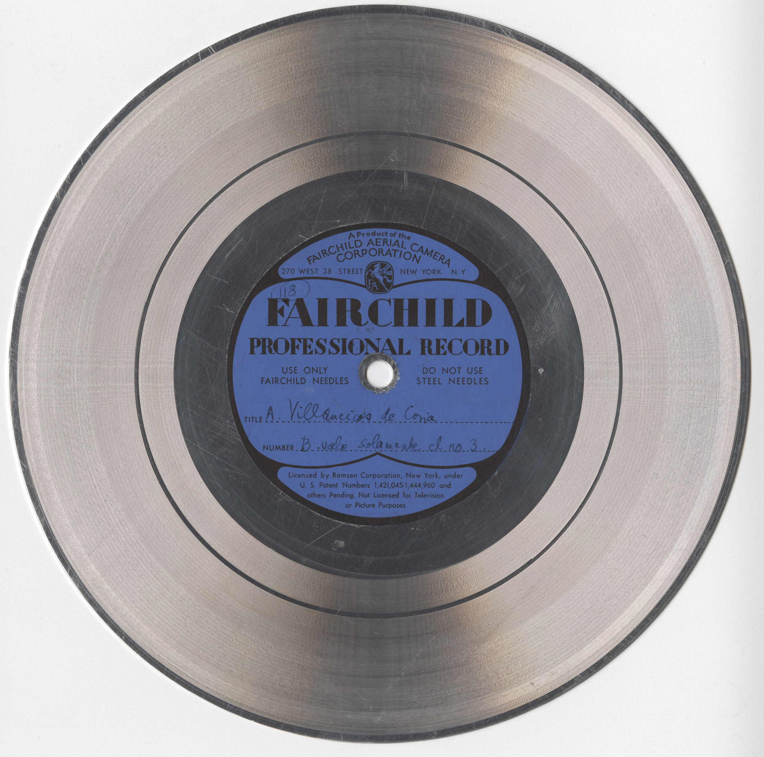 Marca comercial: Fairchild Professional Record (Fairchild Aereal Camera Corporation, New York).
