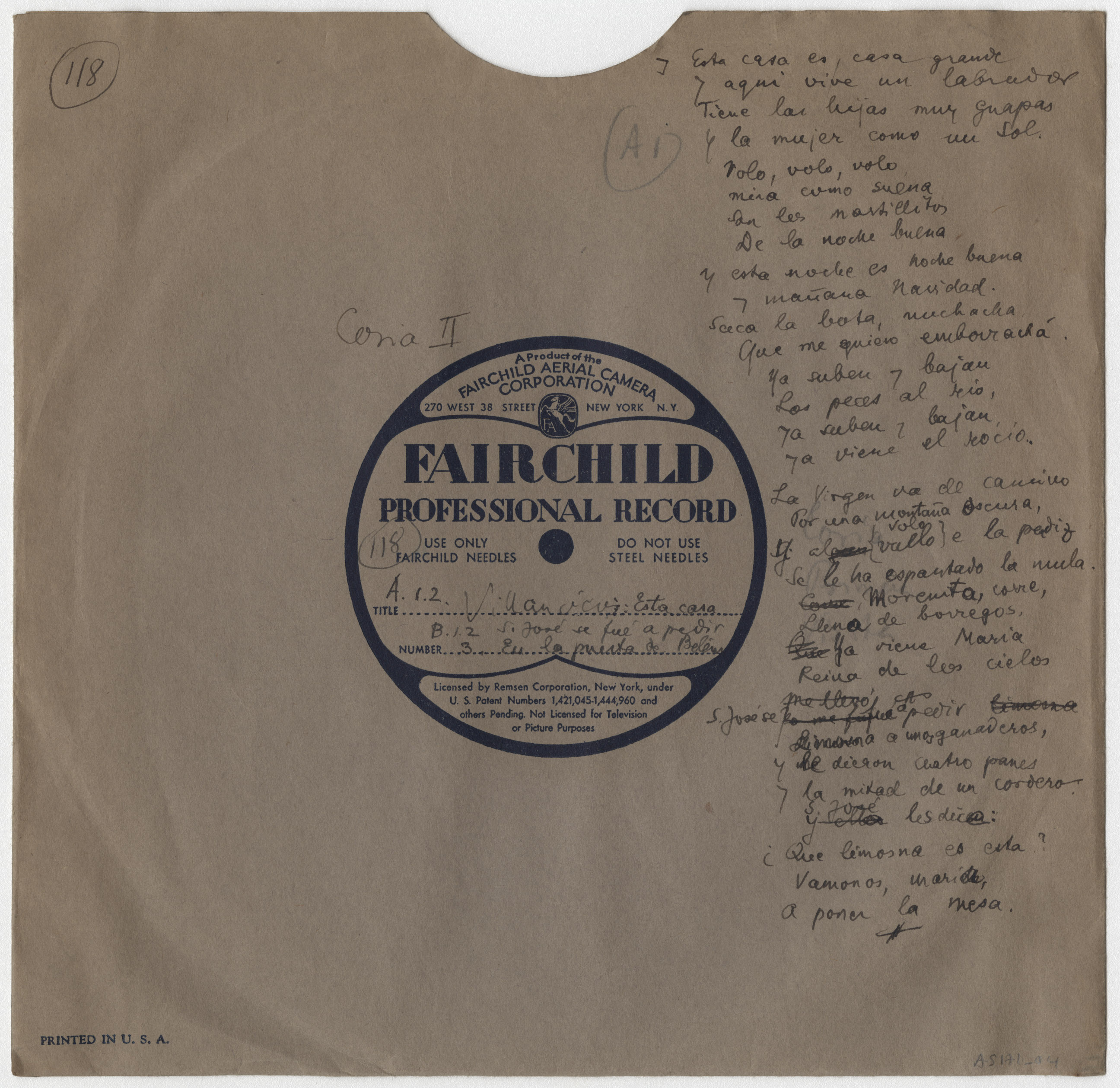 Descripción física: Disco de aluminio. En la etiqueta del disco lleva anotado el lugar y como títulos: A. " Villancicos de Coria" , y B. " vale solamente el nº 3" . En el sobre lleva manuscritos el lugar, los títulos y la letra de las canciones.