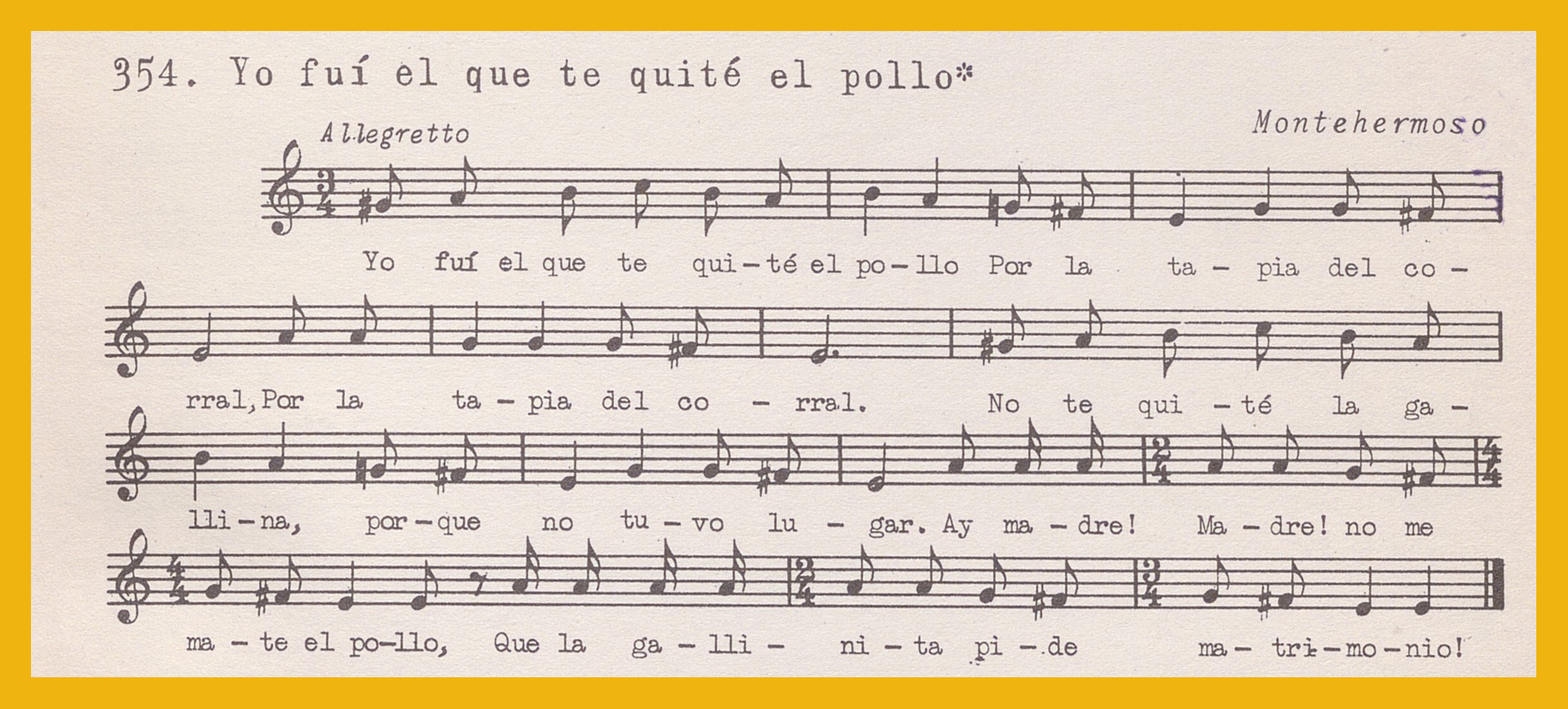 Ref. Partitura transcripción Kurt Schindler (1941): A: «Yo fui el que te quité el pollo» en el registro 354.«Levántate, morenita» en el registro 355.«Y un limón tiré a rodar» en el registro 356.«Si a mi suegra la viera» en el registro 357.«Estaba la molinera» en el registro 359