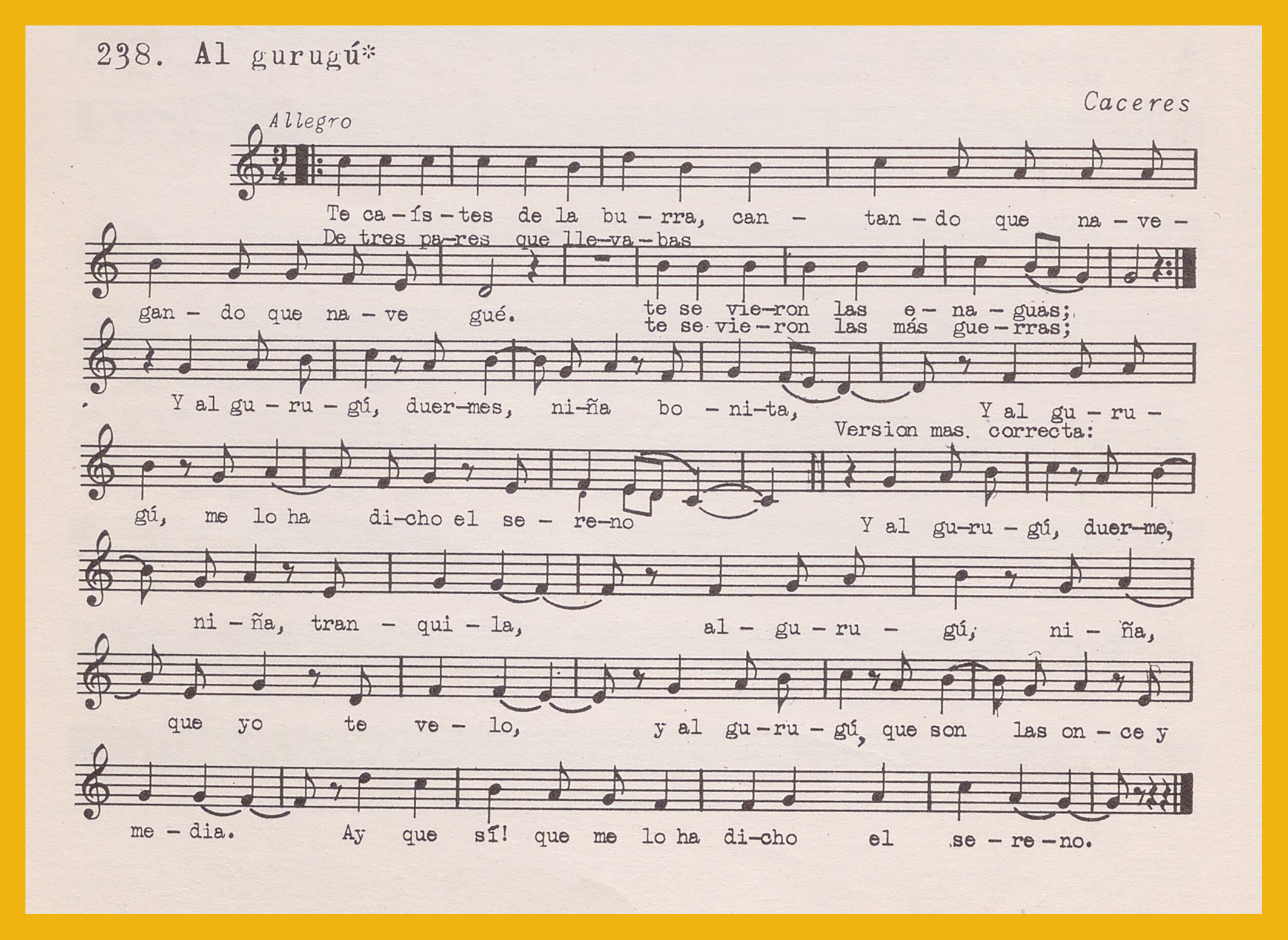 Ref. Partitura transcripción Kurt Schindler (1941): A. «El Sereno», registro nº 236. «El pájaro bobo», registro nº 237. B. Aparece como «Al gurugú», en el registro nº 238