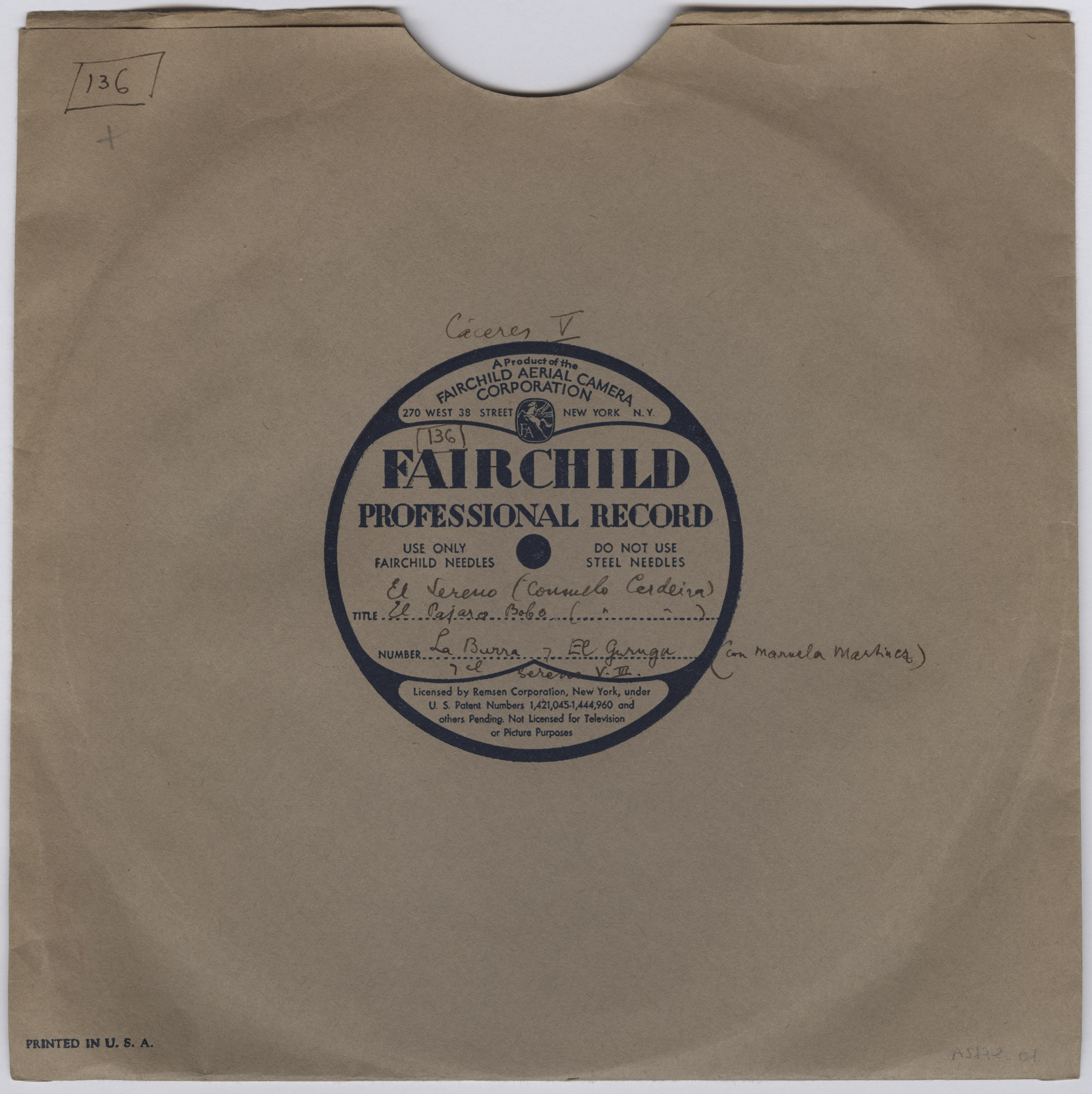 Marca comercial: Fairchild Professional Record (Fairchild Aereal Camera Corporation, New York).