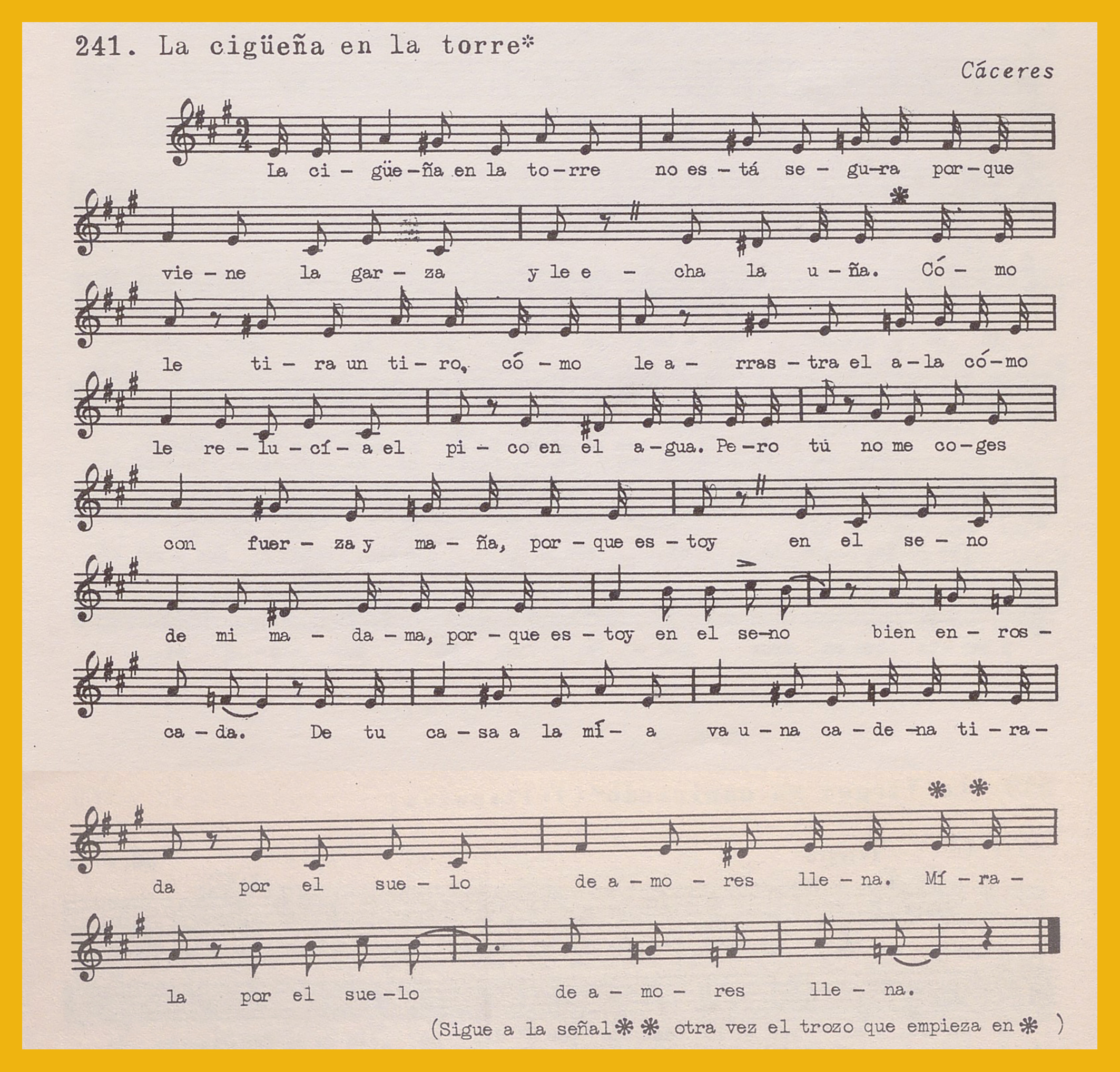 Ref. Partitura transcripción Kurt Schindler (1941): A. «La Virgen va caminando (Villancico)», registro nº 239. «Iban caminando (Villancico)», registro nº 240. «La cigüeña en la torre», registro nº 241. B. «Romance del Niño Perdido». en el registro nº 242