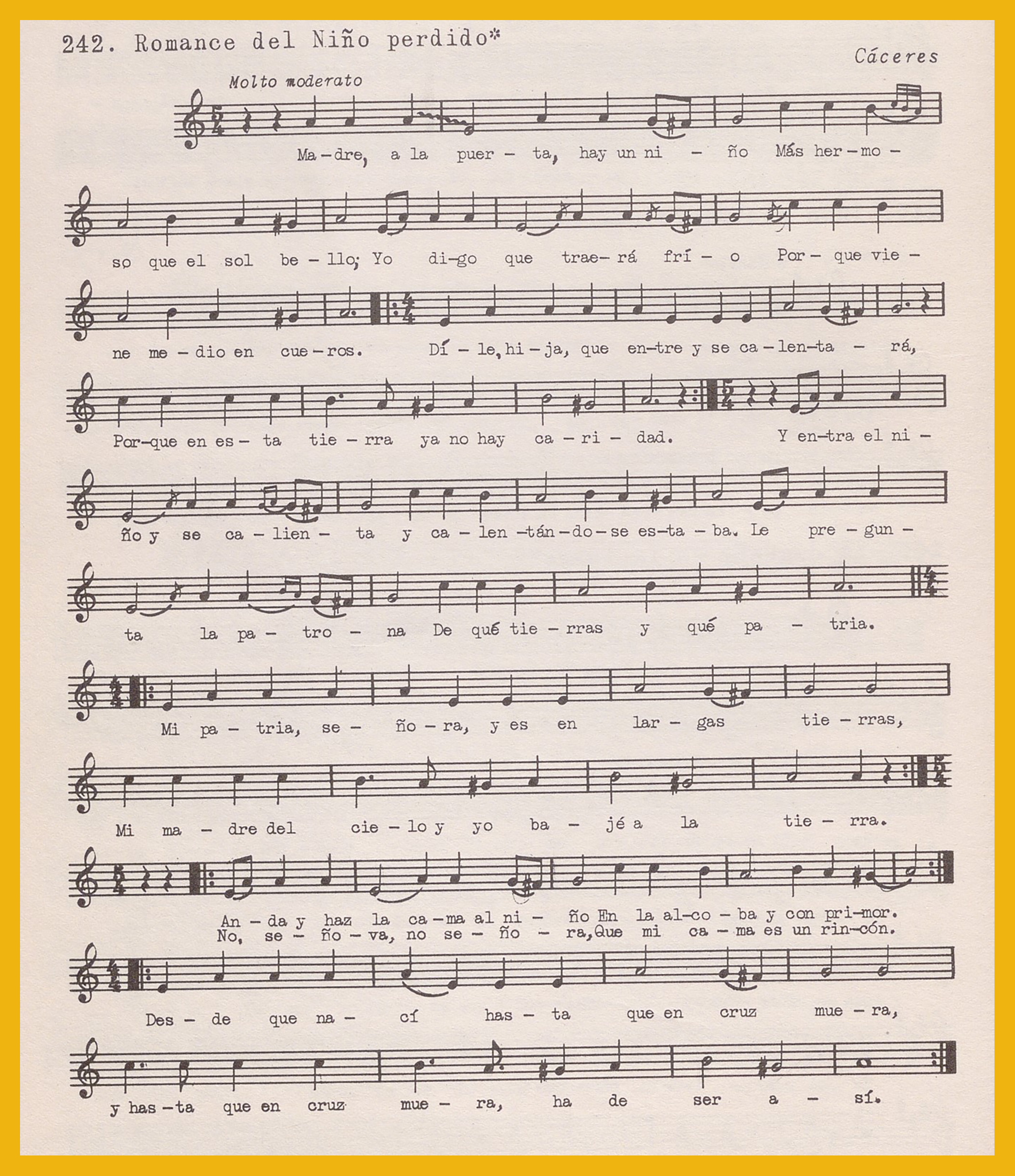Ref. Partitura transcripción Kurt Schindler (1941): A. «La Virgen va caminando (Villancico)», registro nº 239. «Iban caminando (Villancico)», registro nº 240. «La cigüeña en la torre», registro nº 241. B. «Romance del Niño Perdido». en el registro nº 242