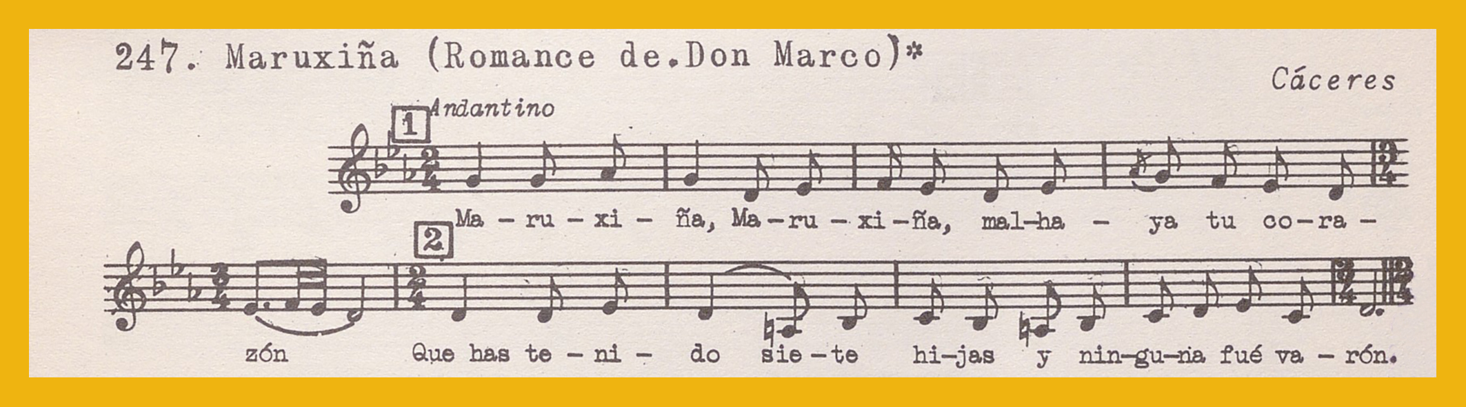 Ref. Partitura transcripción Kurt Schindler (1941): A. «Maruxiña (Romance de Don Marco)», registro nº 247. B. «Plegaria a la Virgen de la Montaña», en el registro nº 248