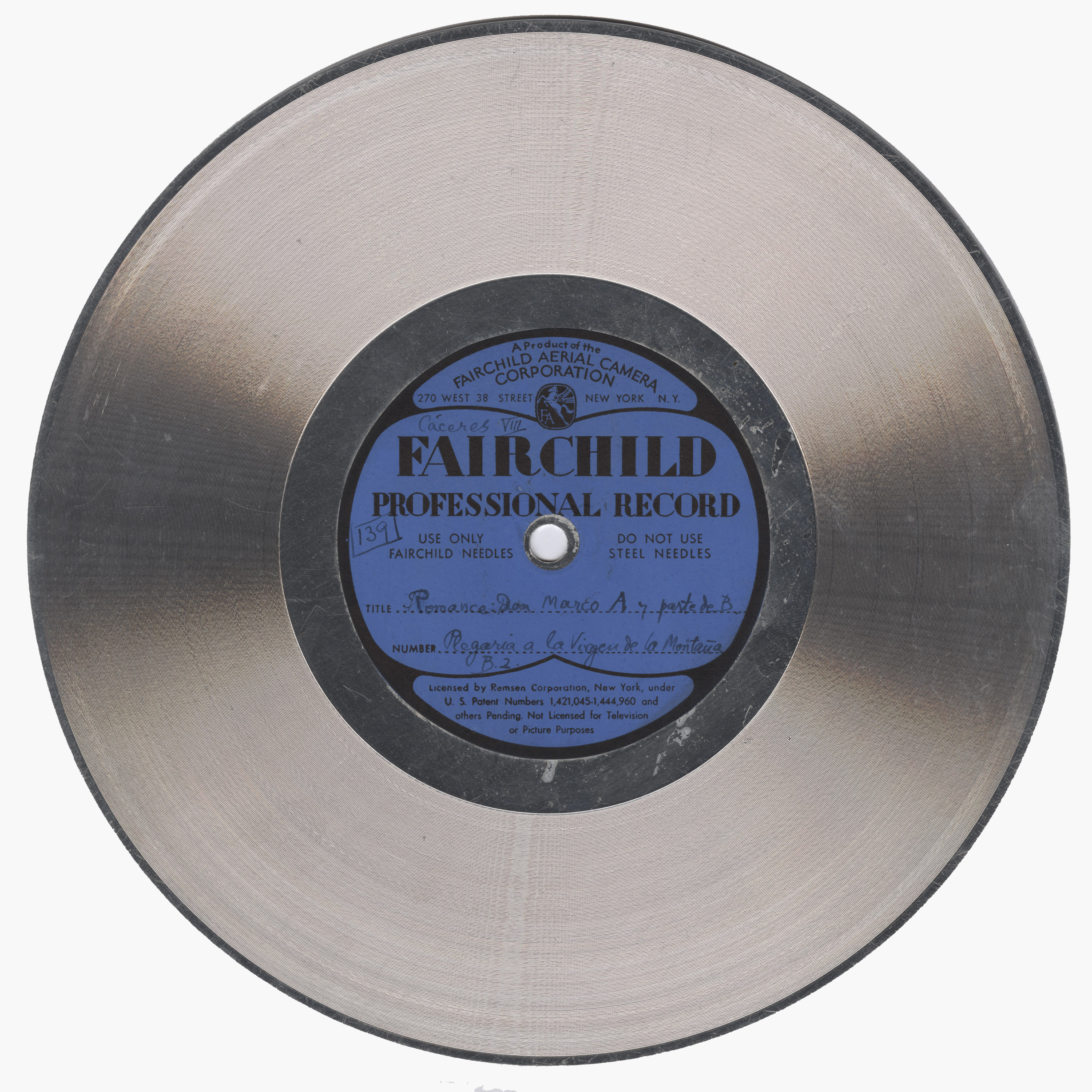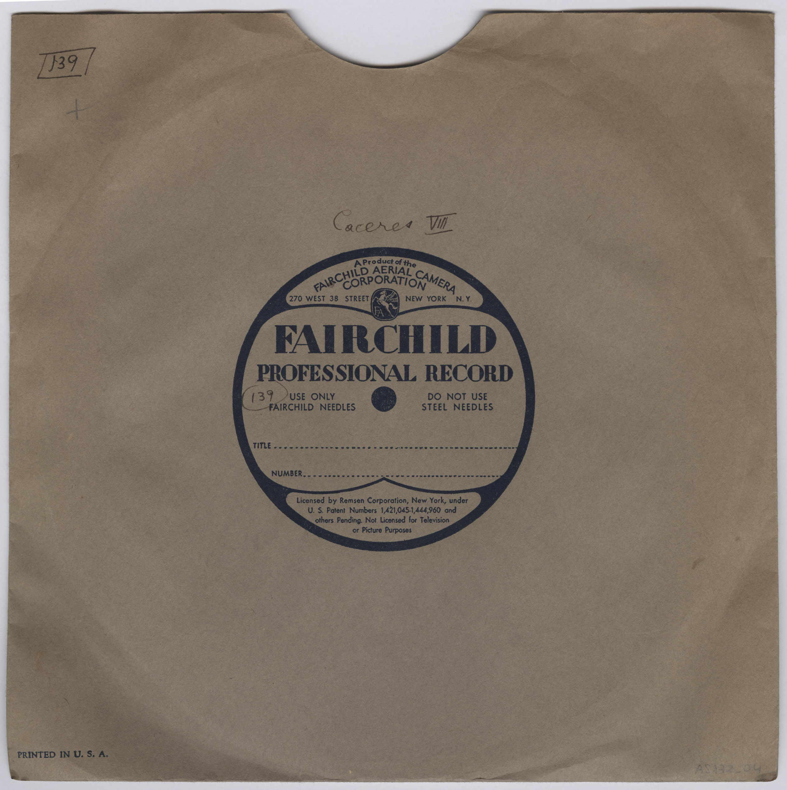Marca comercial: Fairchild Professional Record (Fairchild Aereal Camera Corporation, New York).