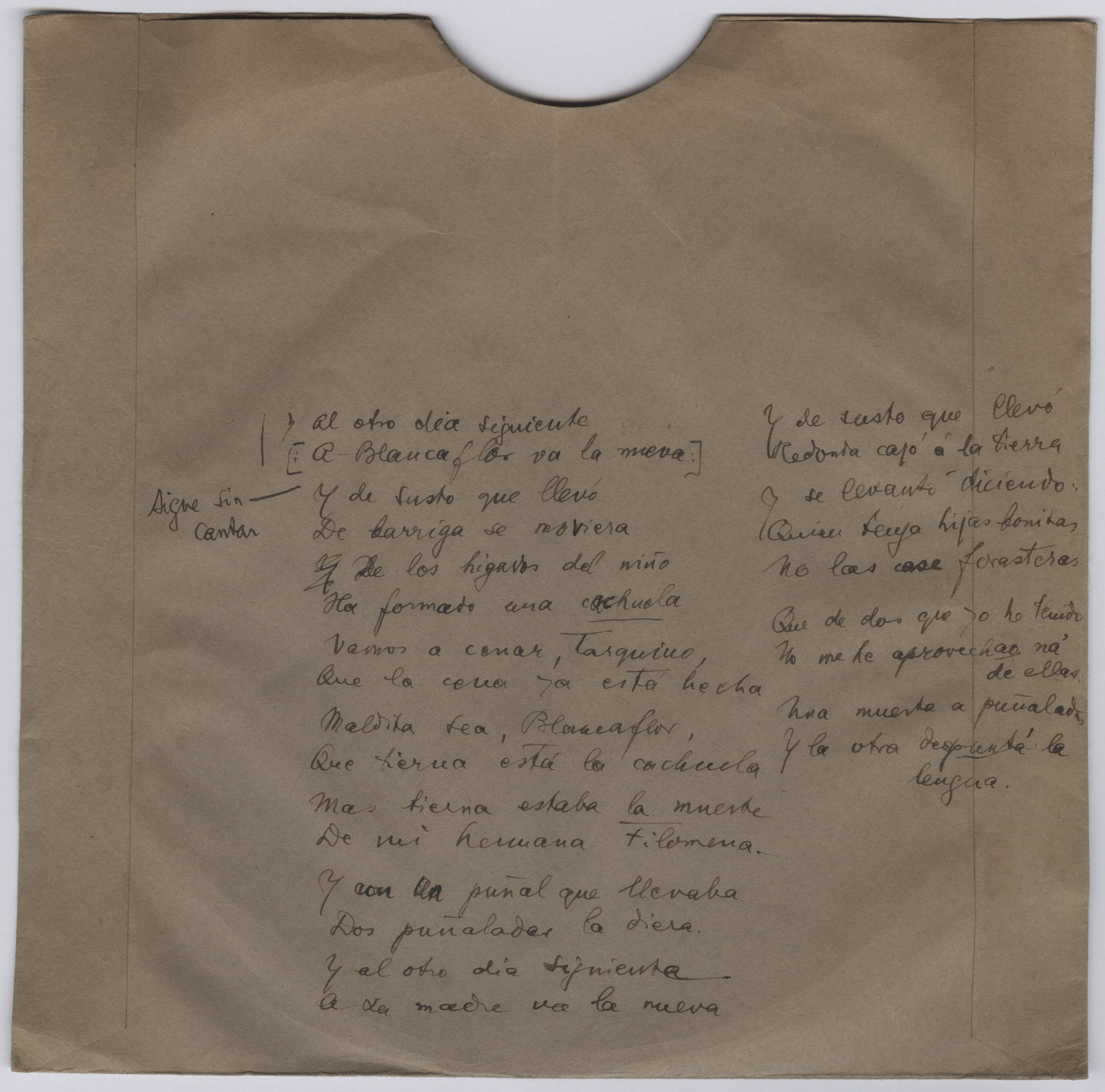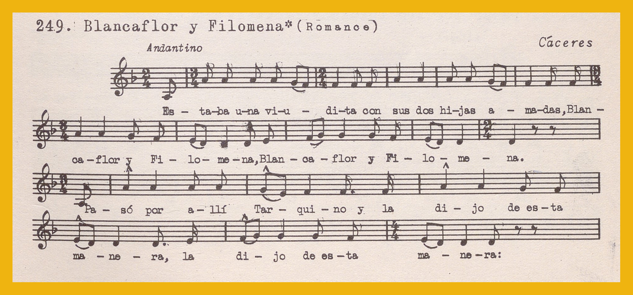 Ref. Partitura transcripción Kurt Schindler (1941): «Blancaflor y Filomena (Romance)», registro nº 249. Interpretado por Consuelo Martínez