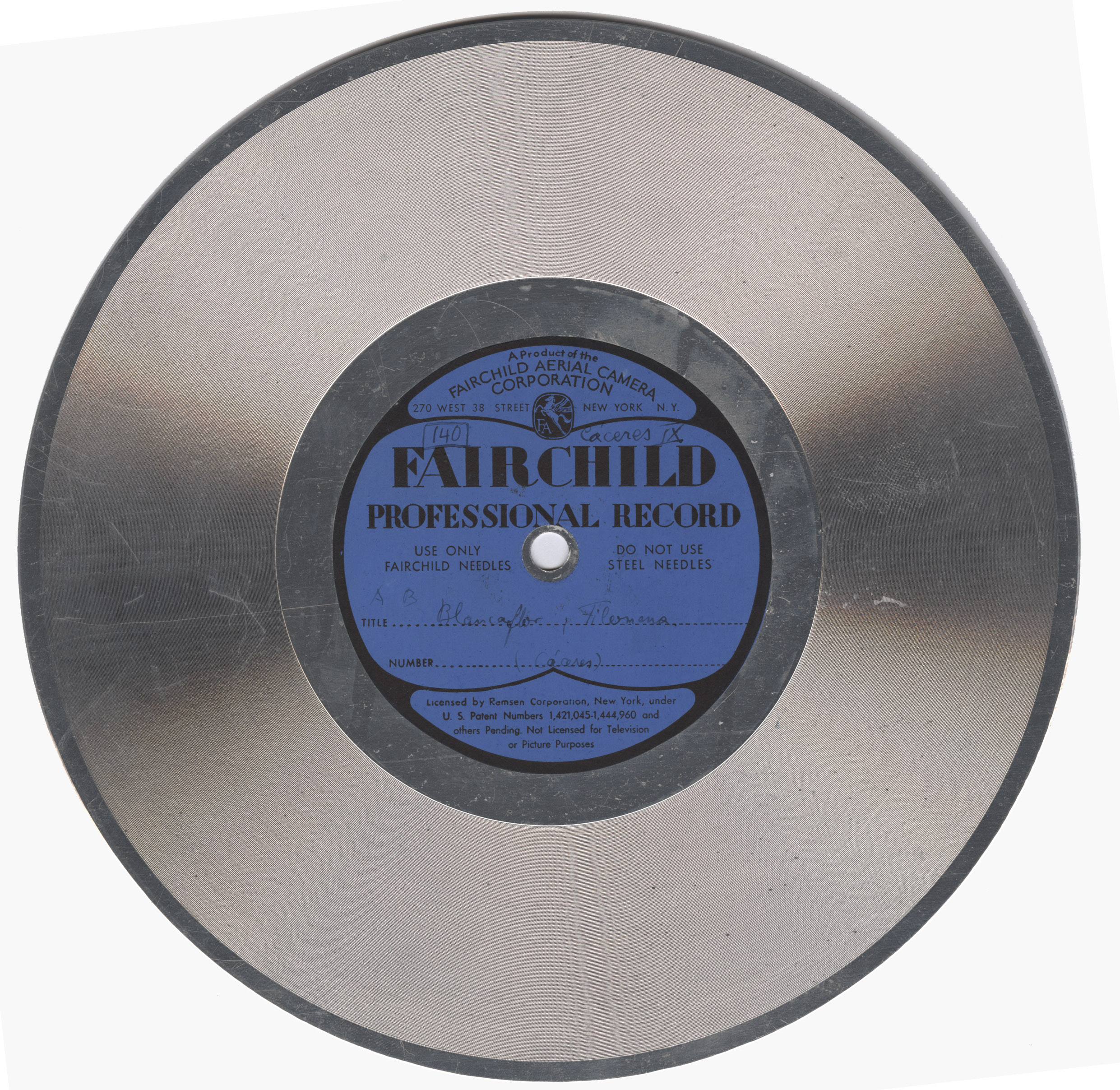 Marca comercial: Fairchild Professional Record (Fairchild Aereal Camera Corporation, New York).