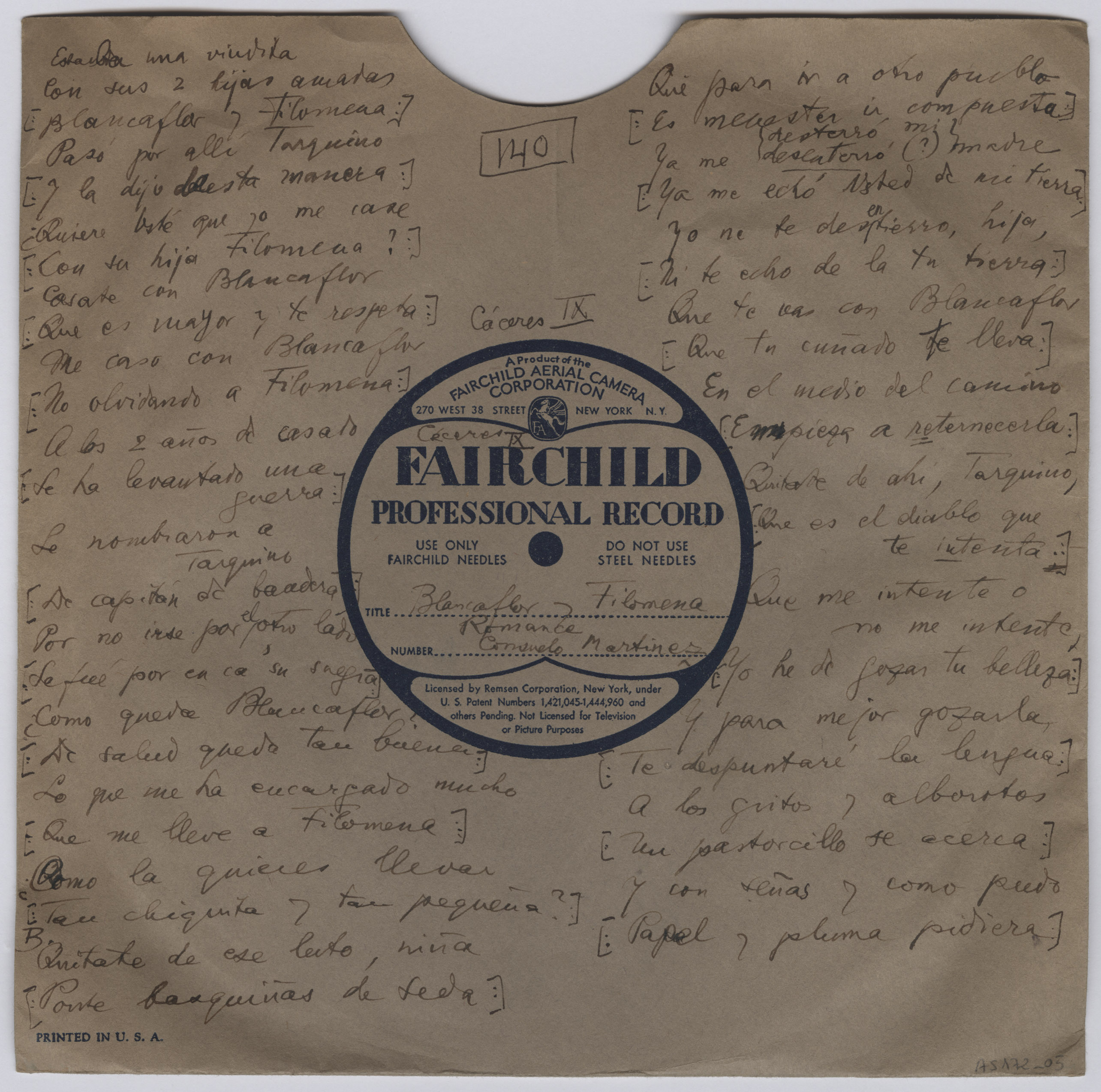 Descripción física: Disco de aluminio. Lleva anotados lugar y títulos de las canciones en la etiqueta del disco. En el sobre lleva manuscrito: Cáceres IX, títulos, letra del romance y la intérprete, Consuelo Martínez. La letra completa sin cantar continua por el reverso.