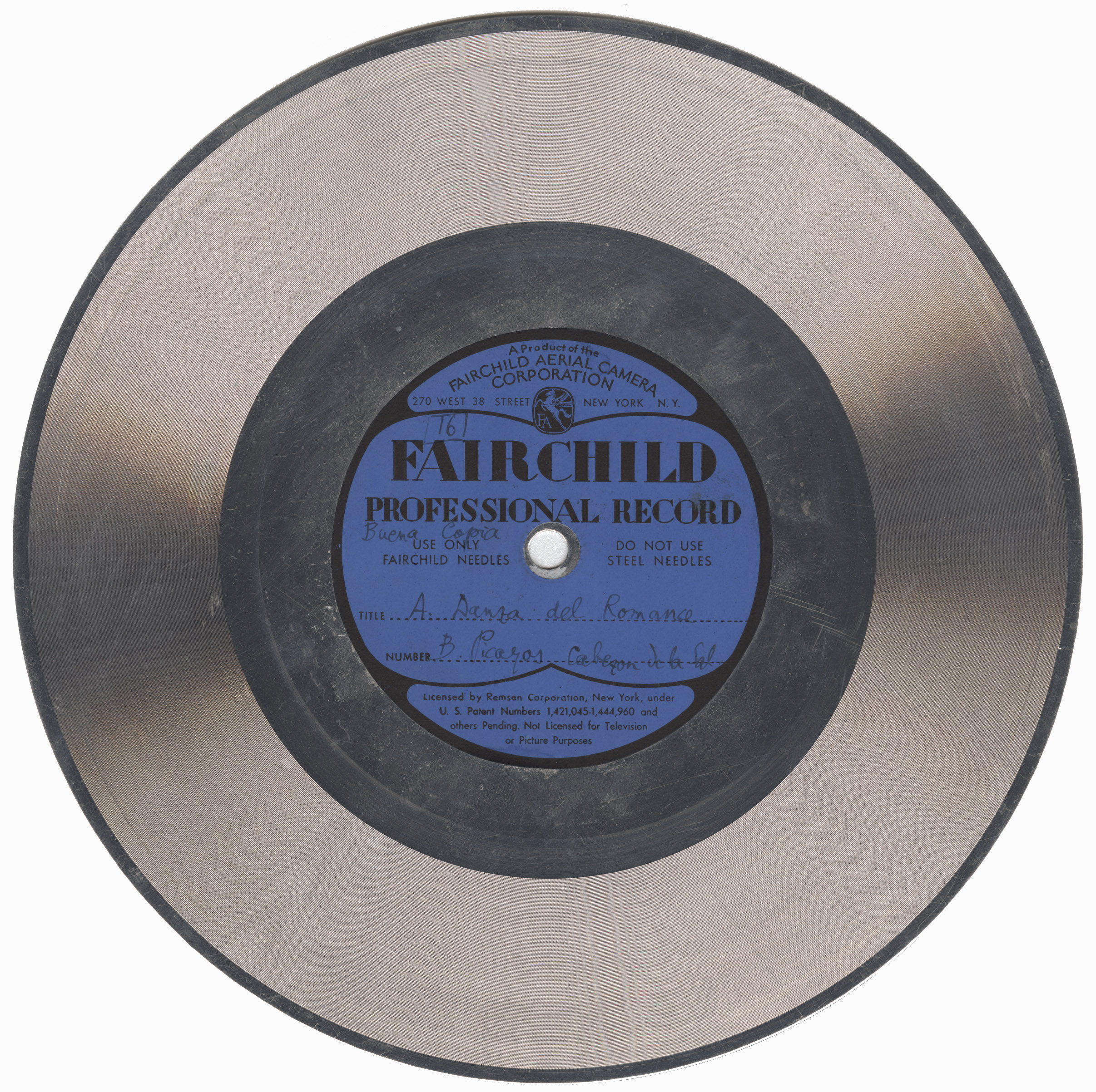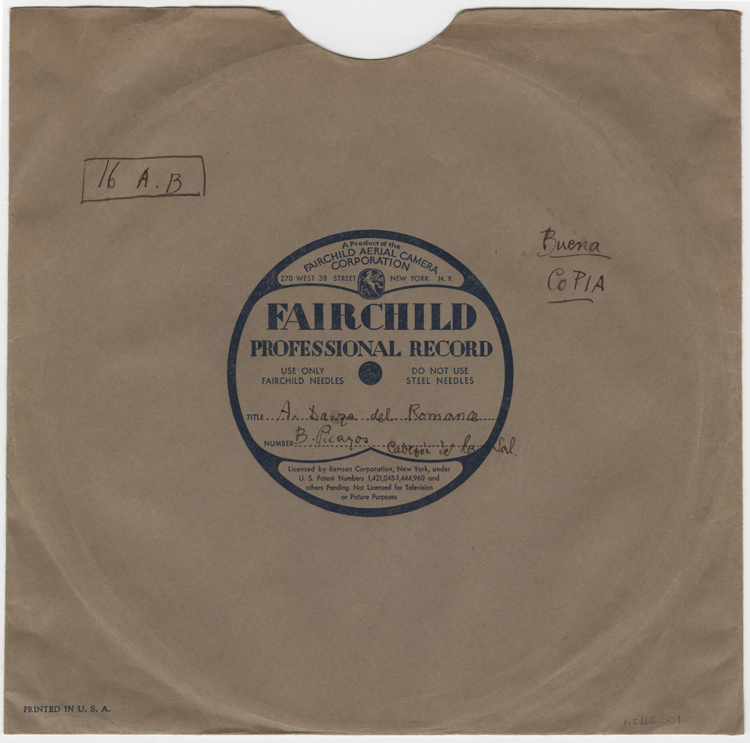 Descripción física: Disco de aluminio. La etiqueta del disco lleva manuscritos los títulos de las canciones y el lugar. Indica que la copia es buena. Lleva la misma información anotada en el sobre.