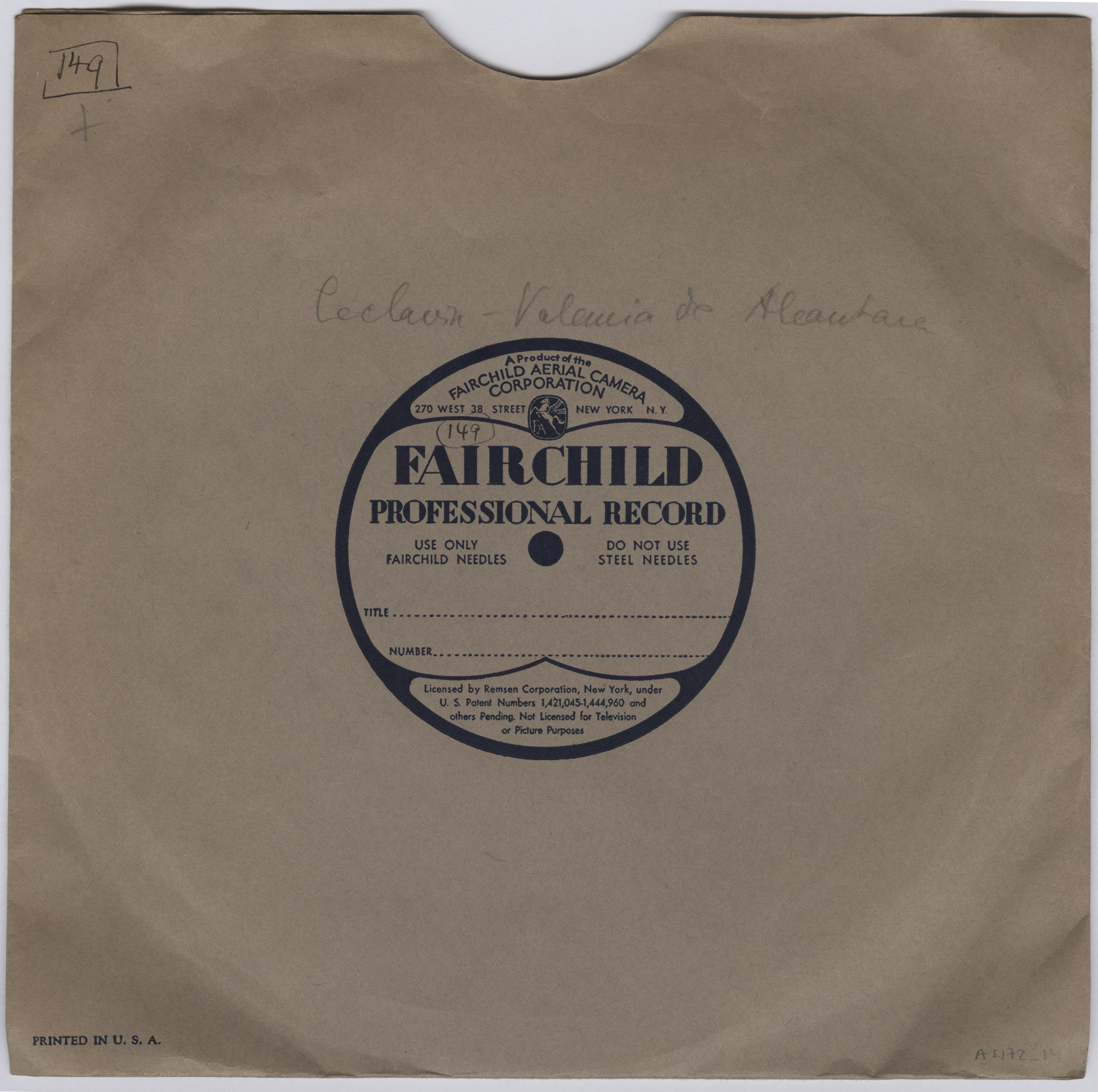 Marca comercial: Fairchild Professional Record (Fairchild Aereal Camera Corporation, New York).