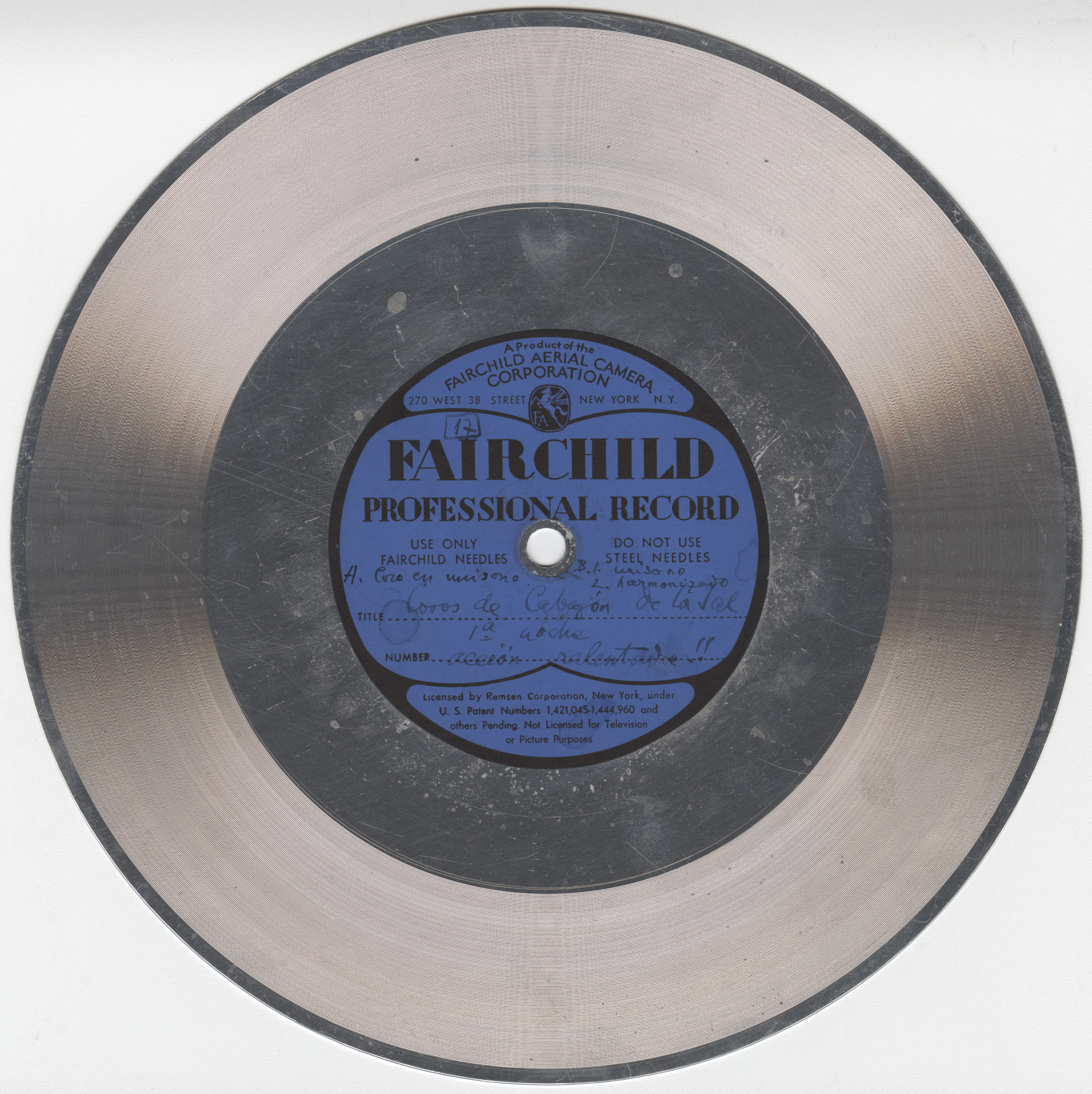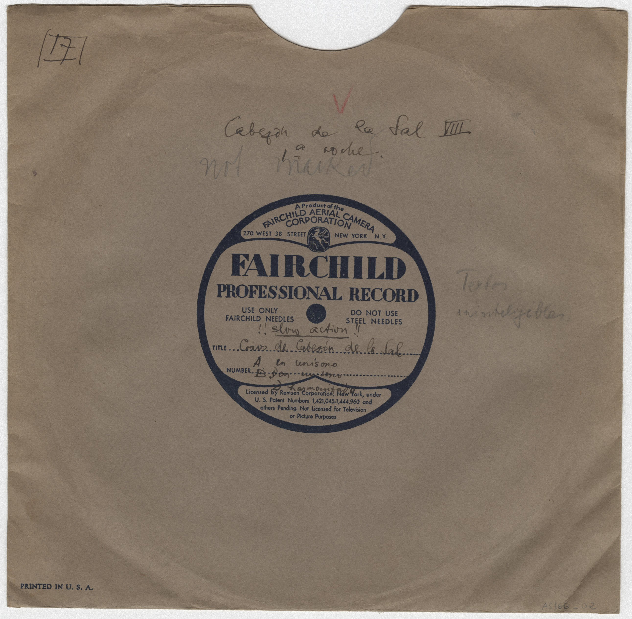 Descripción física: Disco de aluminio. La etiqueta del disco lleva manuscrito el contenido de las caras A y B. Además, " Coros de Cabezón de la Sal, 1ª noche. Acción ralentizada!!" . Lleva una información similar en el sobre e indica " ¡¡Slow action!! y " Textos ininteligibles" anotado a lápiz.