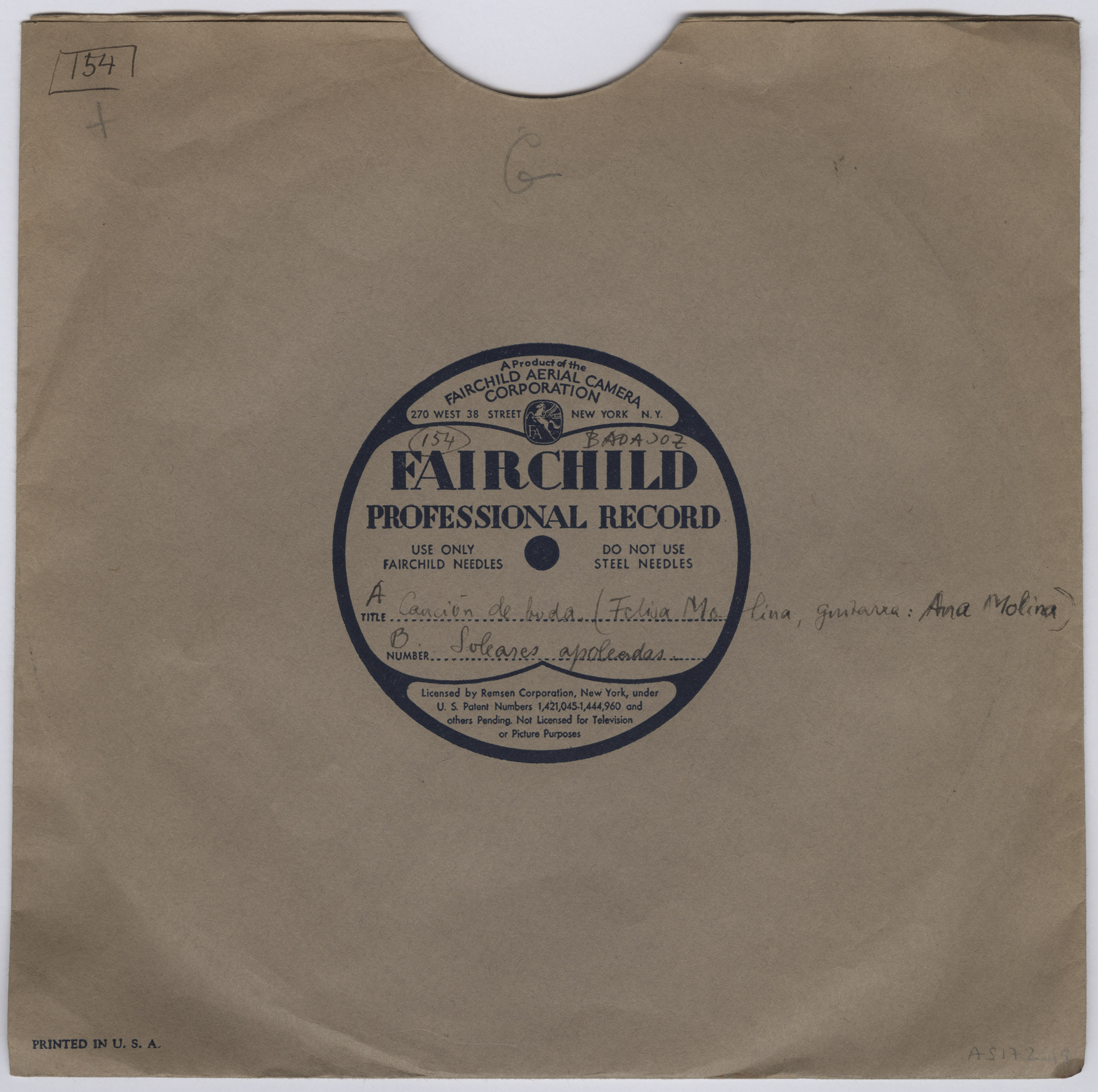 Descripción física: Disco de aluminio. En la etiqueta del disco están anotados el lugar y los títulos de las canciones. En el sobre las letras y las intérpretes: Felisa Molina y guitarra Ana Molina (de la primera).