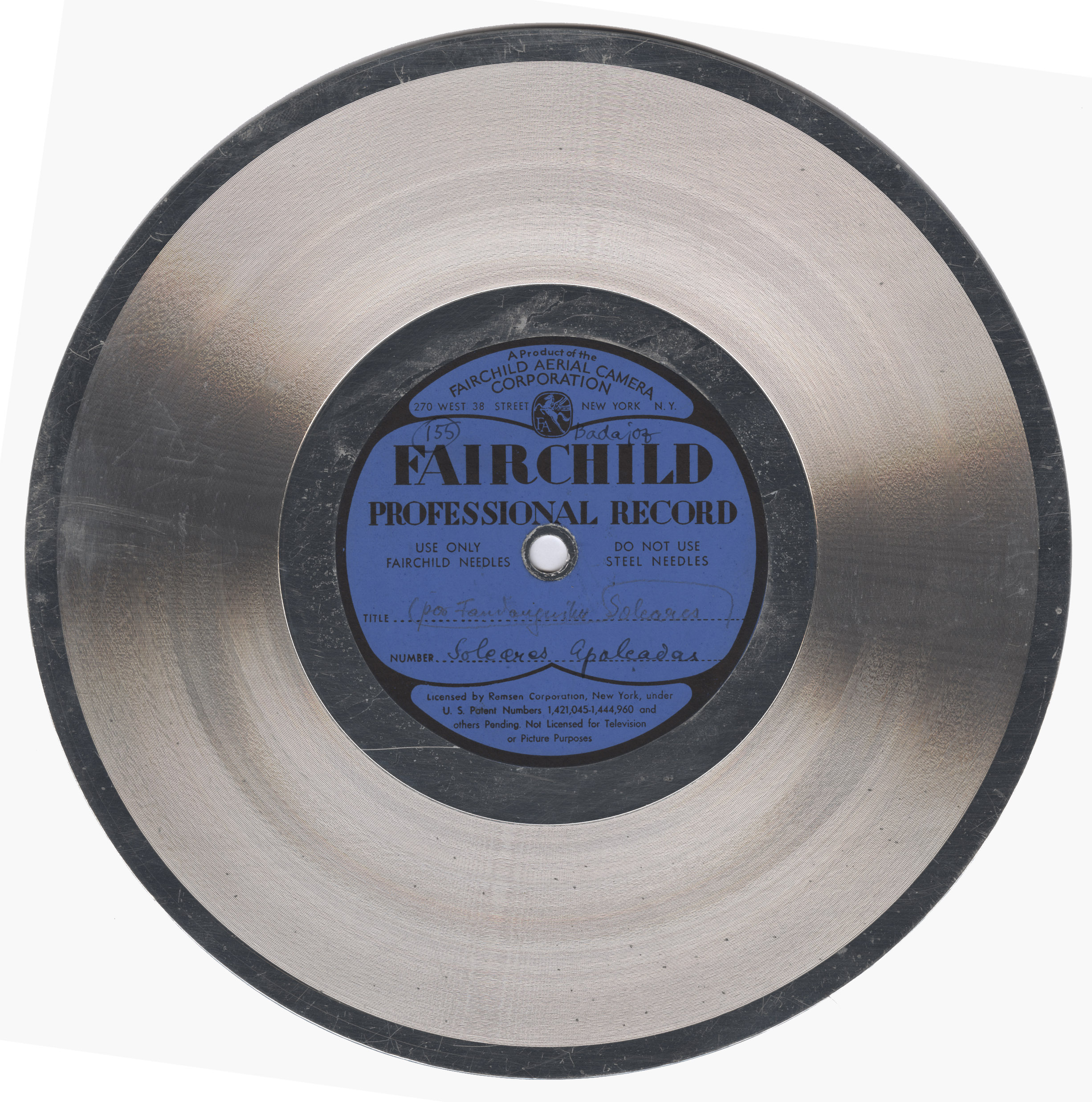Descripción física: Disco de aluminio. En la pegatina del disco: Soleares apoleadas. Por fandanguillos soleares. En la carátula: Soleares apoleás, y las letras.