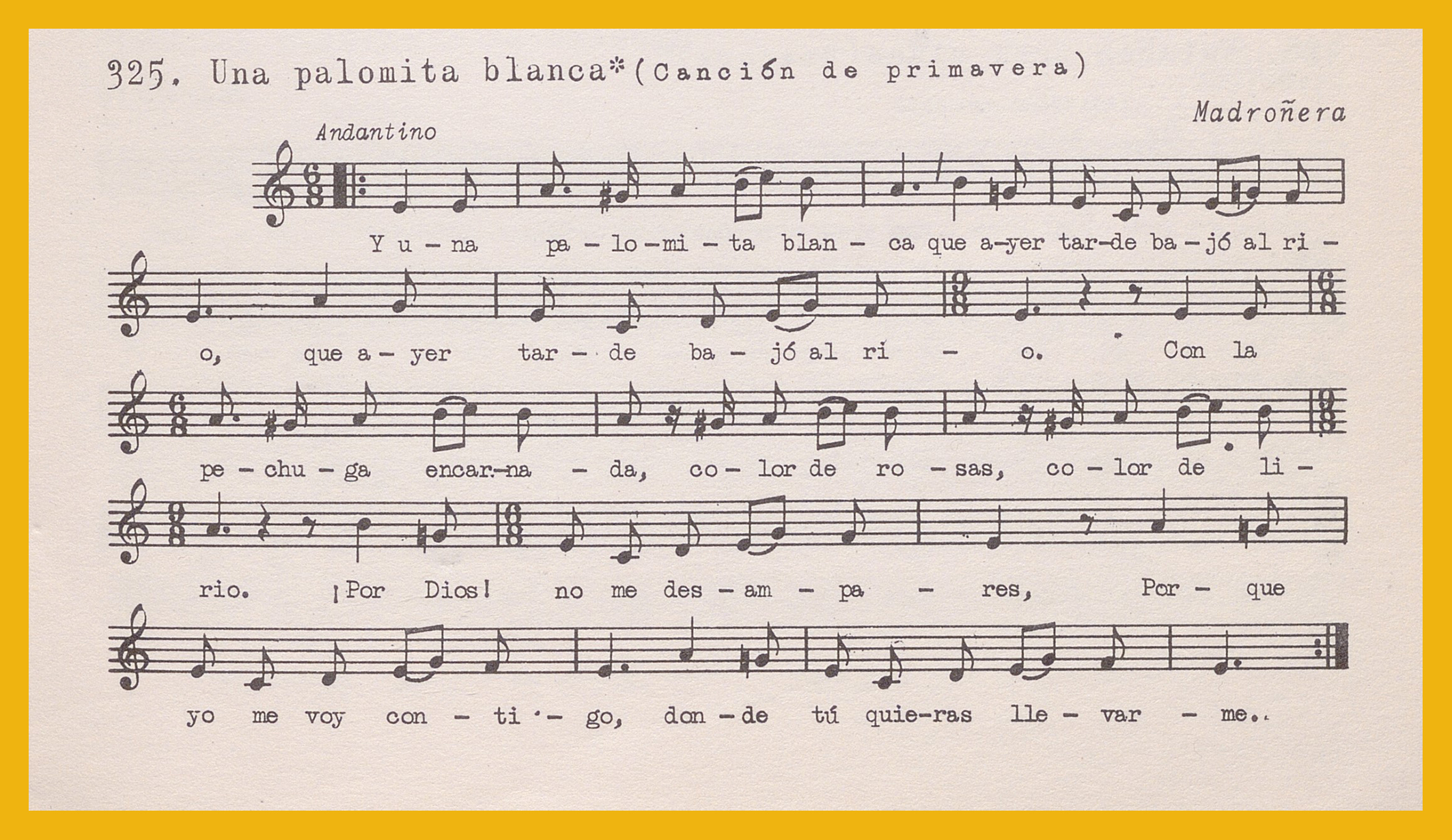 Ref. Partitura transcripción Kurt Schindler (1941): A. «Una palomita blanca (Canción de primavera», registro nº 325. B. «El lechuguino», registro nº 326. «Tengo de subir al árbol», registro nº 327