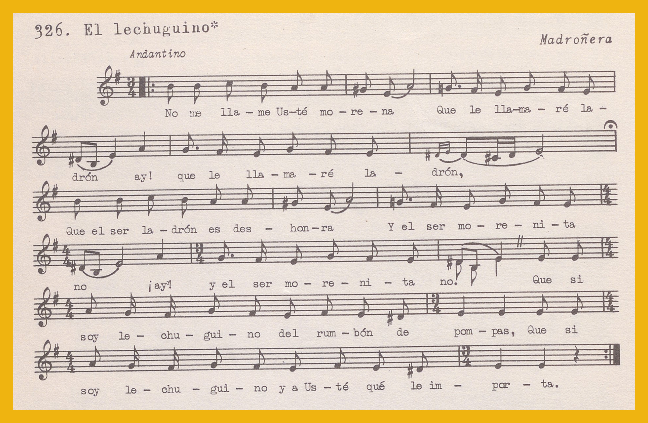 Ref. Partitura transcripción Kurt Schindler (1941): A. «Una palomita blanca (Canción de primavera», registro nº 325. B. «El lechuguino», registro nº 326. «Tengo de subir al árbol», registro nº 327
