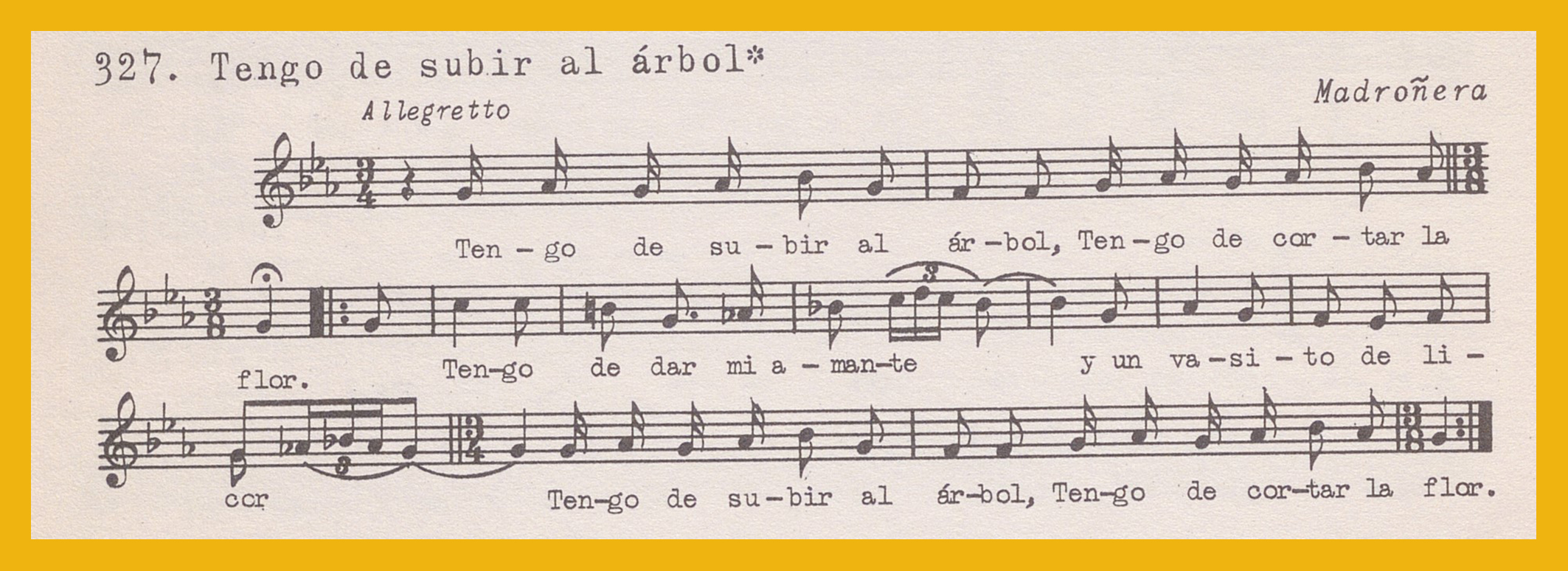 Ref. Partitura transcripción Kurt Schindler (1941): A. «Una palomita blanca (Canción de primavera», registro nº 325. B. «El lechuguino», registro nº 326. «Tengo de subir al árbol», registro nº 327