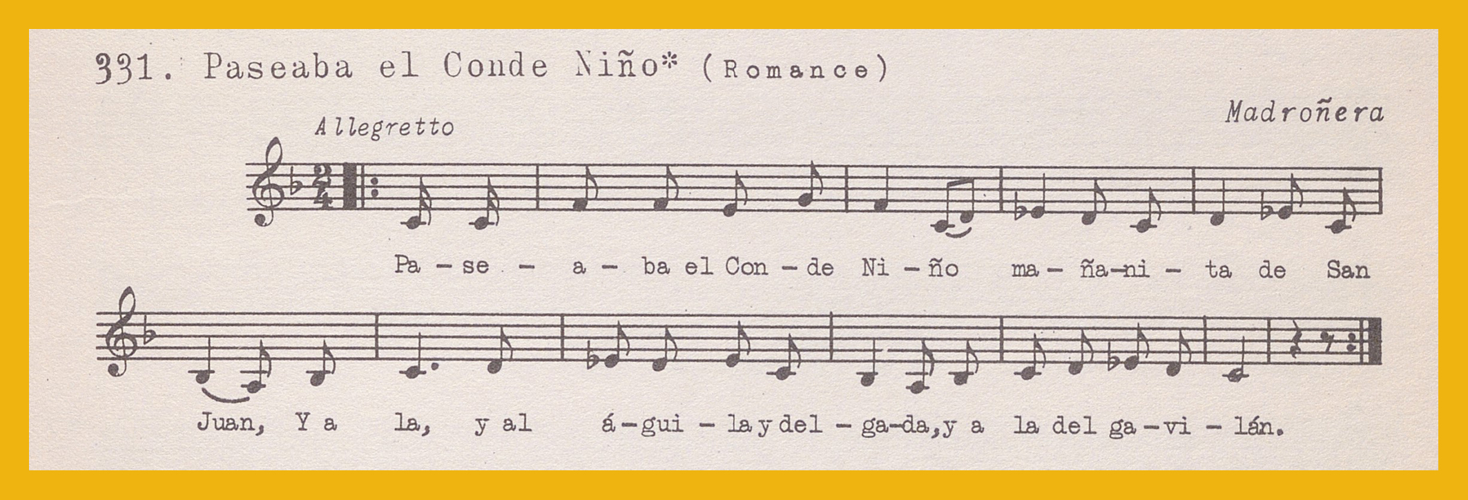 Ref. Partitura transcripción Kurt Schindler (1941): A. «Las tres pastoras (Romance)», registro nº 329. «Un pastor me da voces», registro nº 330. B. «Paseaba el Conde Niño (Romance)», registro nº 331. «La cigüeña y la culebra», registro nº 332 y 333