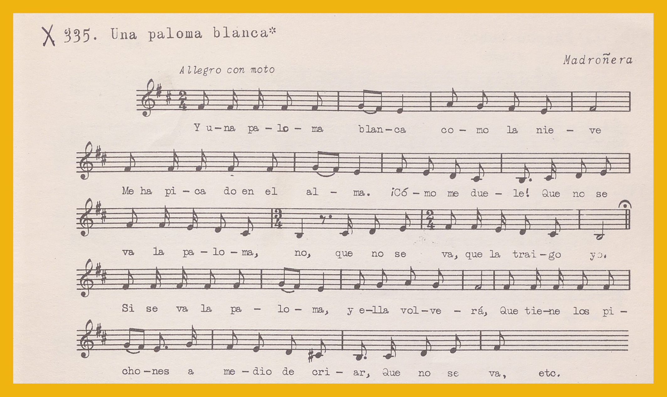 Ref. Partitura transcripción Kurt Schindler (1941): A. «Caramba, María, con tus avellanas», registro nº 334. «Una paloma blanca», registro nº 335. B. «Una teja me llevo», registro nº 336. «En Mayo era (Romance)», registro nº 337