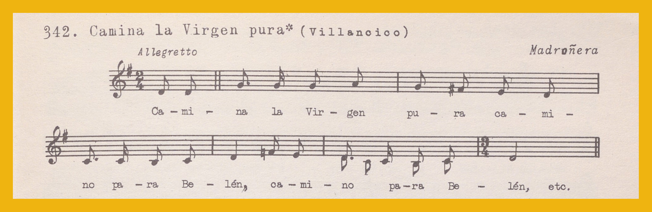 Ref. Partitura transcripción Kurt Schindler (1941): A. «Camina la Virgen Pura», registro nº 342. «El reloj de San Martín», registro nº 388. B. «Estaban tres niñas bordando corbatas», registro nº 328