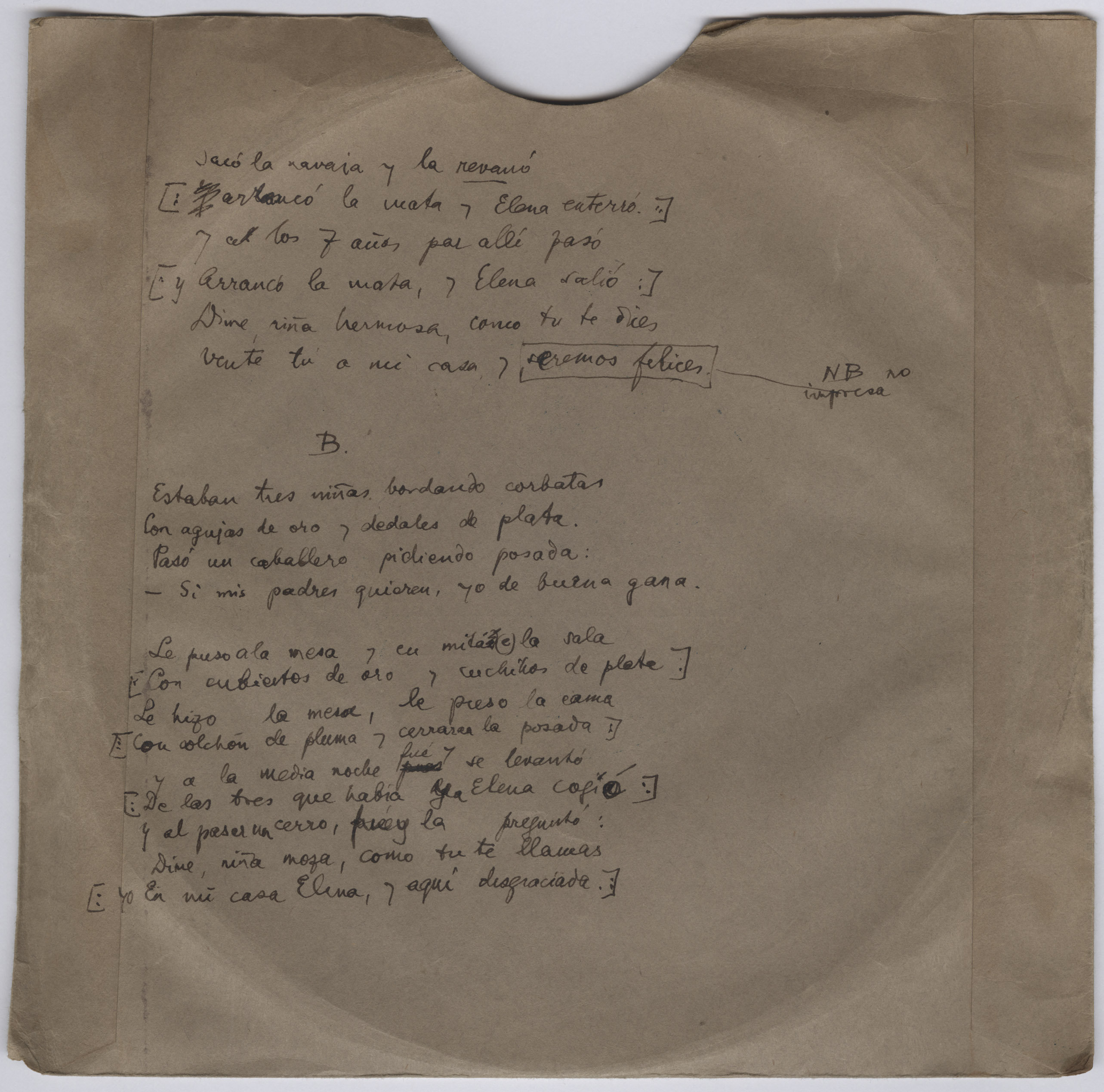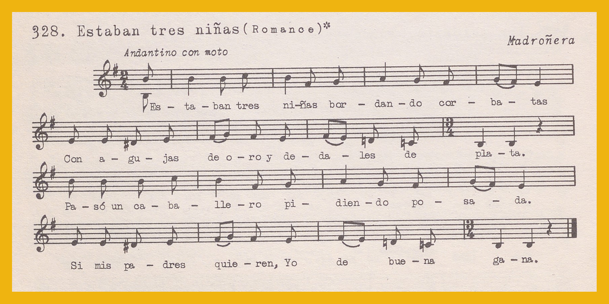 Ref. Partitura transcripción Kurt Schindler (1941): A. «Camina la Virgen Pura», registro nº 342. «El reloj de San Martín», registro nº 388. B. «Estaban tres niñas bordando corbatas», registro nº 328