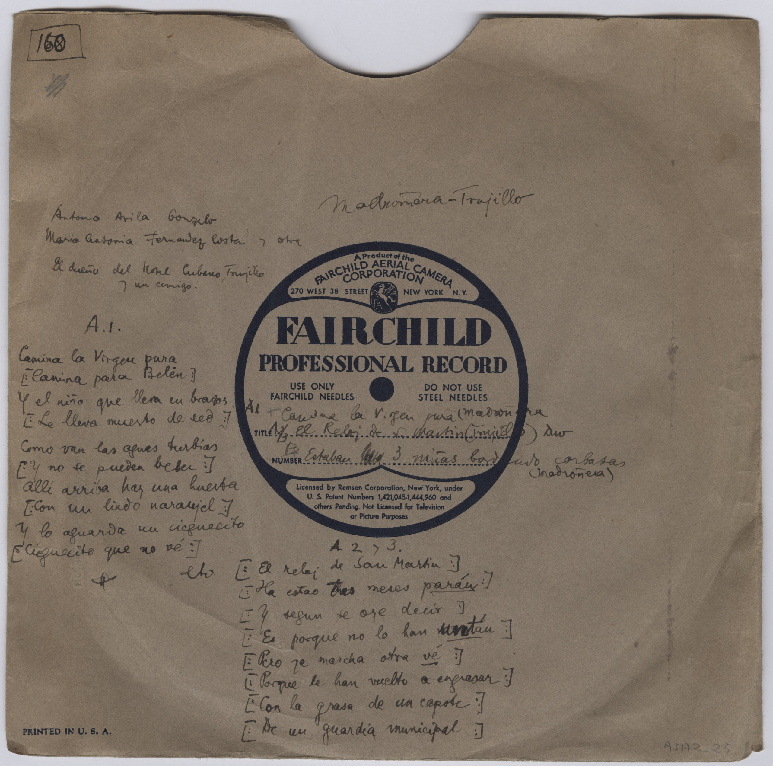 Descripción física: Disco de aluminio. En la etiqueta del disco lleva anotados el lugar y los títulos: 1. Camina la Virgen pura (Madroñera); ; 2. y 3. Al reloj de San Martín (Trujillo).B. Estaban tres niñas bordando corbatas (Madroñera). En el sobre lleva escritos las letras de las canciones y los intérpretes: Antonia Ávila Gonzalo, María Antonia Fernández Costa, otra, el dueño del Hotel Cubano (Trujillo) y un amigo.