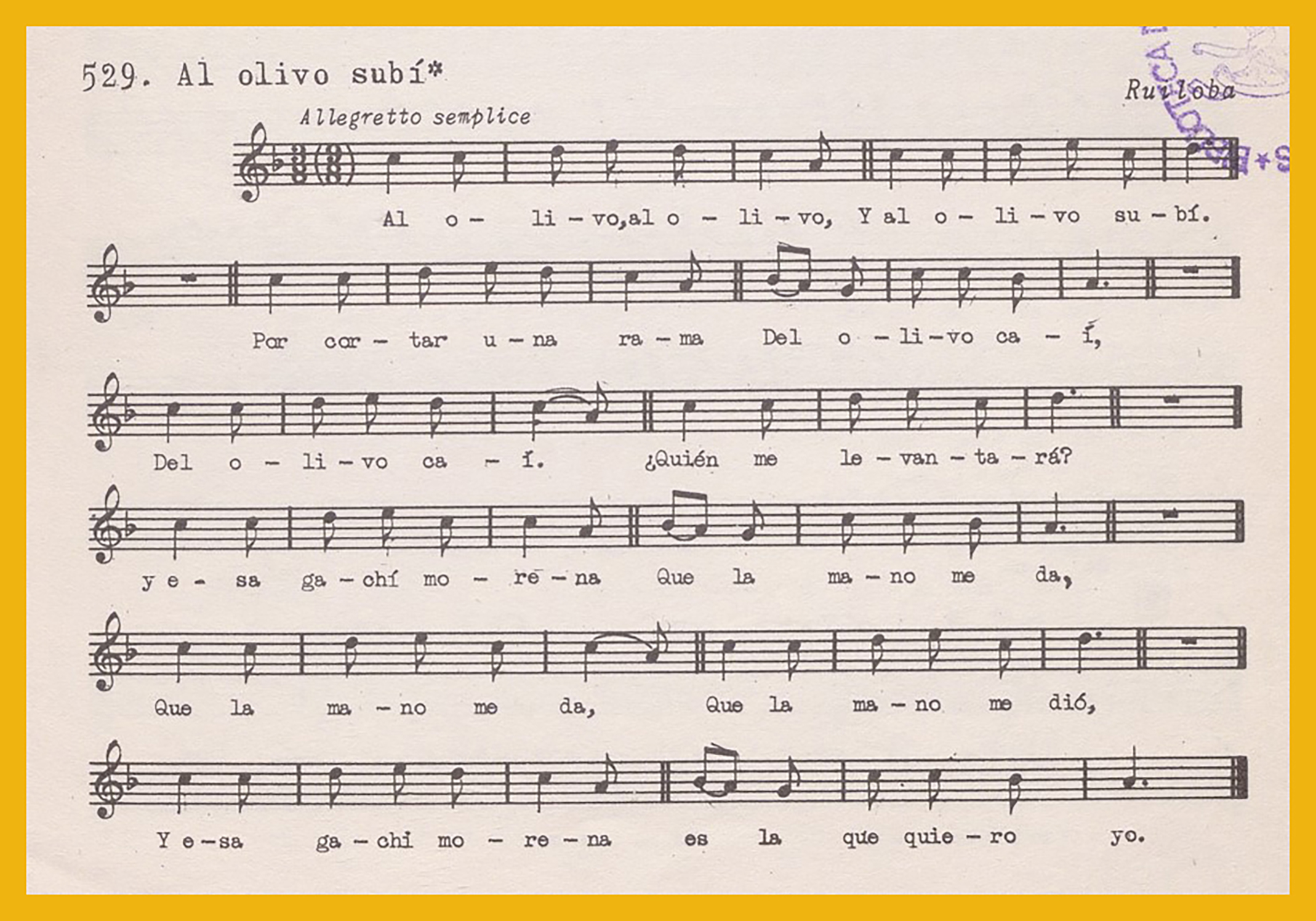 Ref. Partitura transcripción Kurt Schindler (1941): A. «Al entrar tengo miedo», registro nº. 526. «Una palomita blanca», registro nº. 527. B. «Canción de Ruiloba», registro nº. 528. «Al olivo subí», registro nº. 529