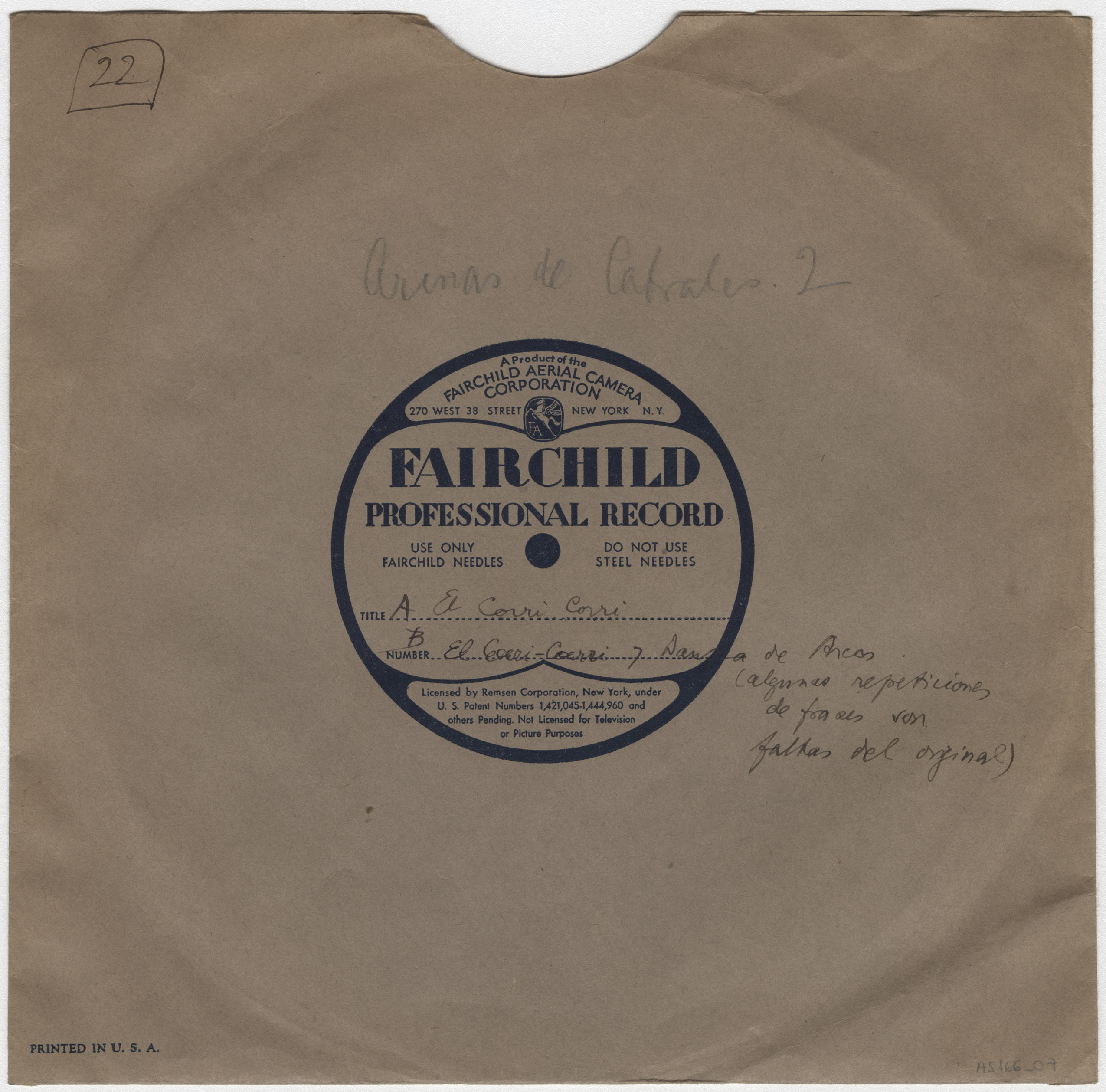 Descripción física: Disco de aluminio. Lleva el lugar y los títulos de las canciones anotados en la etiqueta del disco, además señala que es una copia buena. En el sobre, el título está escrito a lápiz e indica " algunas repeticiones de frases con faltas del original" .