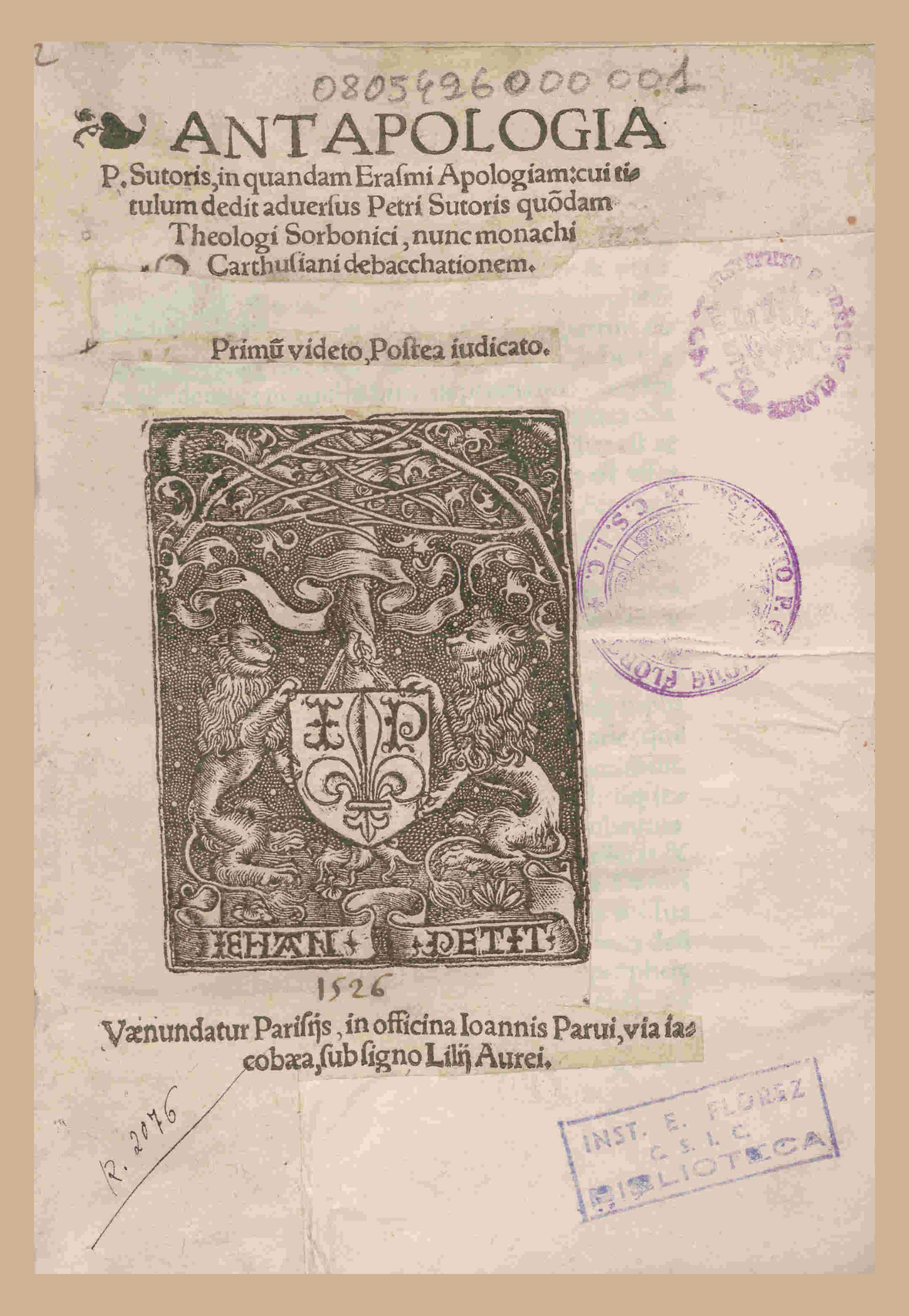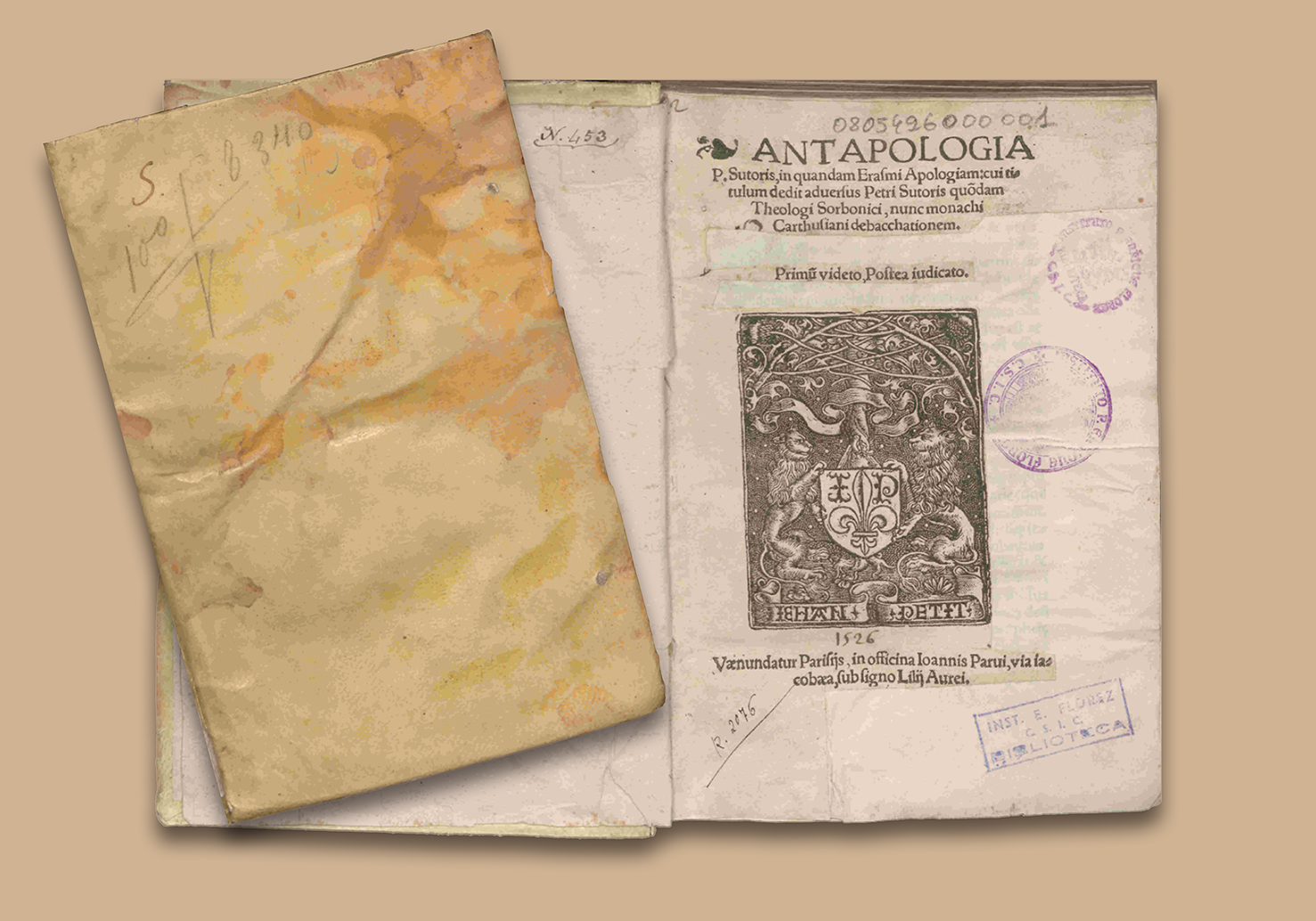 Composición de cubierta y portada de la obra Antapologia P. Sutoris, in quandam Erasmi Apologiam