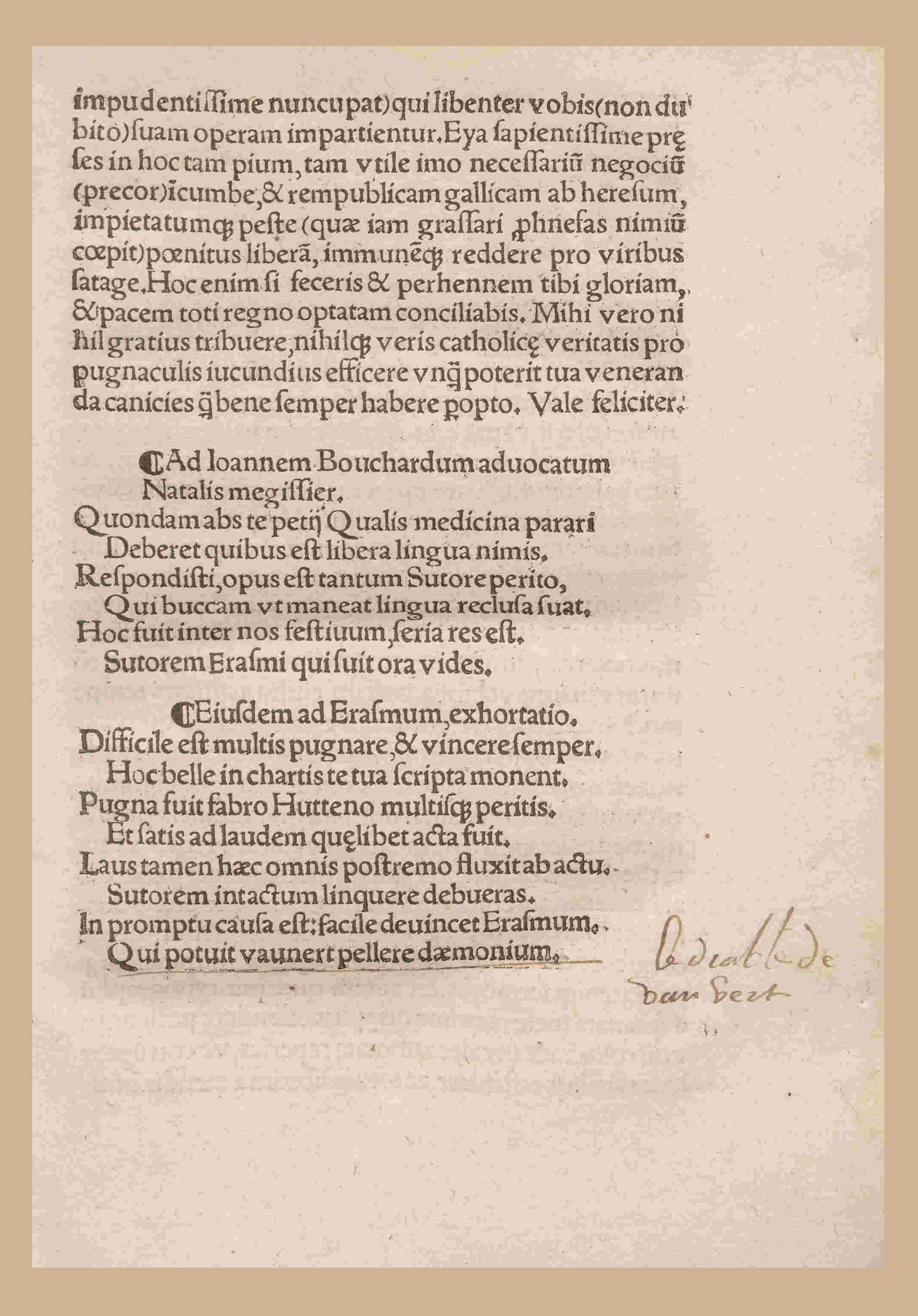 En una carta de mayo 1527, Erasmo escribe a William Warham, su protector y arzobispo de Londres: “En todas las naciones del mundo, las páginas de las obras de Erasmo, independientemente de su valor, son preservadas de forma respetuosa, mientras que los libros de hombres como Cousturier y Beda son la risa de los escolares”.